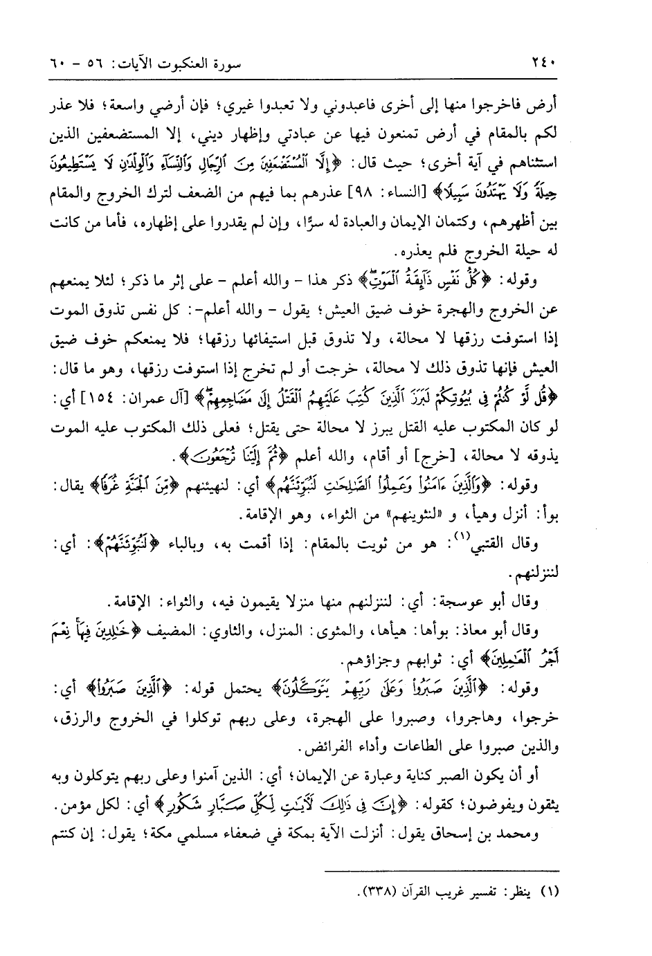 وقوله: (كُلُّ نَفْسٍ ذَائِقَةُ الْمَوْتِ ثُمَّ إِلَيْنَا تُرْجَعُونَ (57) ذكر هذا - واللَّه أعلم - على إثر ما ذكر؛ لئلا يمنعهم عن الخروج والهجرة خوف ضيق العيش؛ يقول - واللَّه أعلم -: كل نفس تذوق الموت إذا استوفت رزقها لا محالة، ولا تذوق قبل استيفائها رزقها؛ فلا يمنعكم خوف ضيق العيش فإنها تذوق ذلك لا محالة، خرجت أو لم تخرج إذا استوفت رزقها، وهو ما قال: (قُلْ لَوْ كُنْتُمْ فِي بُيُوتِكُمْ لَبَرَزَ الَّذِينَ كُتِبَ عَلَيْهِمُ الْقَتْلُ إِلَى مَضَاجِعِهِمْ)، أي: لو كان المكتوب عليه القتل يبرز لا محالة حتى يقتل؛ فعلى ذلك المكتوب عليه الموت يذوقه لا محالة، أخرج، أو أقام، واللَّه أعلم (ثُمَّ إِلَيْنَا تُرْجَعُونَ).