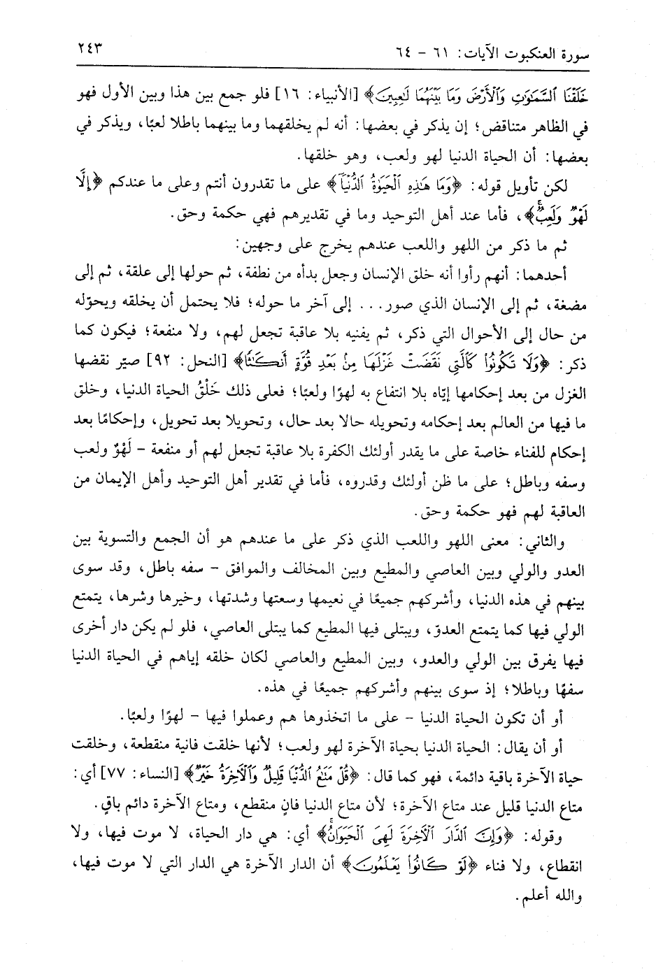 والثاني: معنى اللهو: اللعب الذي ذكر على ما عندهم هو أن الجمع والتسوية بين العدو والولي وبين العاصي والمطيع وبين المخالف والموافق - سفه باطل، وقد سوى بينهم في هذه الدنيا، وأشركهم جميعًا في نعيمها وسعتها وشدتها، وخيرها وشرها، يتمتع الولي فيها كما يتمتع العدو، ويبتلى فيها المطيع كما يبتلى العاصي، فلو لم يكن دار أخرى فيها يفرق بين الولي والعدو، وبين المطيع والعاصي لكان خلقه إياهم في الحياة الدنيا سفهًا وباطلا؛ إذ سوى بينهم وأشركهم جميعًا في هذه.