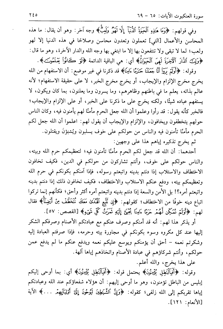 وقوله: (أَوَلَمْ يَرَوْا أَنَّا جَعَلْنَا حَرَمًا آمِنًا وَيُتَخَطَّفُ النَّاسُ مِنْ حَوْلِهِمْ أَفَبِالْبَاطِلِ يُؤْمِنُونَ وَبِنِعْمَةِ اللَّهِ يَكْفُرُونَ (67) قد ذكرنا في غير موضع: أن الاستفهام من الله يخرج مخرج الإلزام والإيجاب، أو يخرج مخرج الخبر، لا على حقيقة الاستفهام؛ لأنه عالم بذاته، يعلم ما في باطنهم وظاهرهم، وما يسرون وما يعلنون، بما كان ويكون، لا يستفهم عباده شيئًا، ولكنه يخرج على ما ذكرنا على الخبر، أو على الإلزام والإيجاب؛ فالخبر كأنه يقول: قد رأوا وعلموا أن اللَّه جعل الحرم مأمنًا لهم يأمنون فيه، وكان الناس حولهم يتخطفون ويخافون، والإلزام والإيجاب أن يقول لهم: اعلموا أن اللَّه جعل لكم