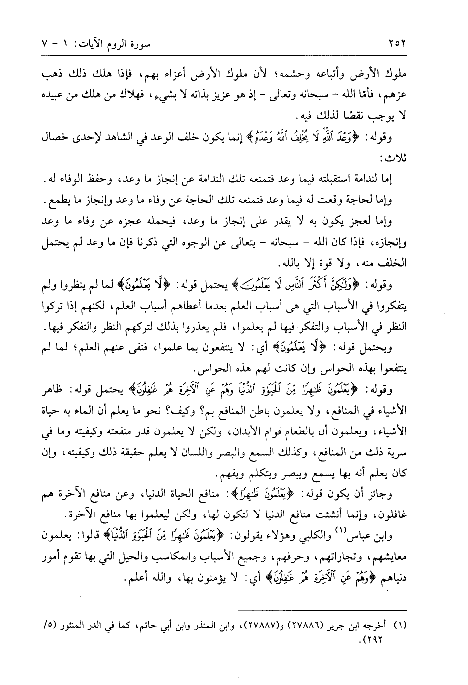 وجائز أن يكون قوله: (يَعْلَمُونَ ظَاهِرًا): منافع الحياة الدنيا، وعن منافع الآخرة هم غافلون، وإنَّمَا أنشئت منافع الدنيا لا لتكون لها، ولكن ليعلموا بها منافع الآخرة.