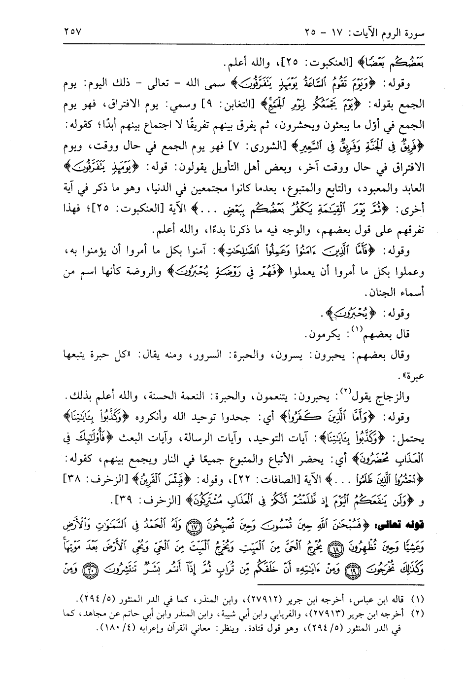 وقوله: (فَأَمَّا الَّذِينَ آمَنُوا وَعَمِلُوا الصَّالِحَاتِ فَهُمْ فِي رَوْضَةٍ يُحْبَرُونَ (15) آمنوا بكل ما أمروا أن يؤمنوا به، وعملوا بكل ما أمروا أن يعملوا (فَهُمْ فِي رَوْضَةٍ يُحْبَرُونَ) والروضة كأنها اسم من أسماء الجنان.