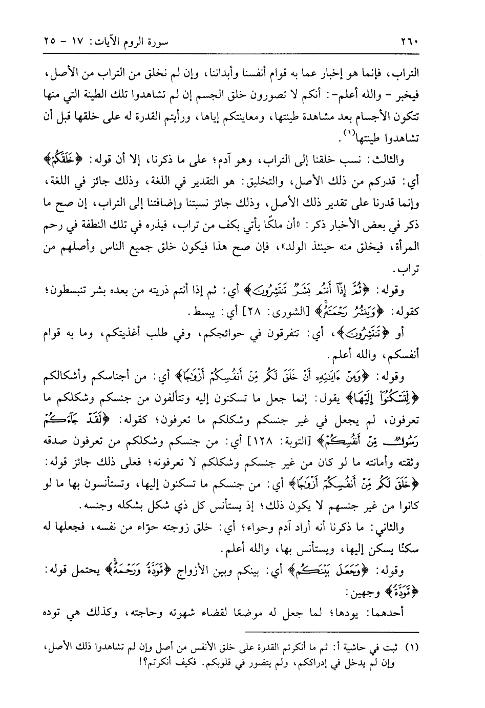 وقوله: (وَمِنْ آيَاتِهِ أَنْ خَلَقَ لَكُمْ مِنْ أَنْفُسِكُمْ أَزْوَاجًا لِتَسْكُنُوا إِلَيْهَا وَجَعَلَ بَيْنَكُمْ مَوَدَّةً وَرَحْمَةً إِنَّ فِي ذَلِكَ لَآيَاتٍ لِقَوْمٍ يَتَفَكَّرُونَ (21) أي: من أجناسكم وأشكالكم (لِتَسْكُنُوا إِلَيْهَا) يقول: إنما جعل ما تسكنون إليه وتتألفون من جنسكم وشكلكم ما تعرفون، لم يجعل في غير جنسكم وشكلكم ما تعرفون؛ كقوله: (لَقَدْ جَاءَكُمْ رَسُولٌ مِنْ أَنْفُسِكُمْ)، أي: من جنسكم وشكلكم من تعرفون صدقه وثقته وأمانته ما لو كان من غير جنسكم وشكلكم لا تعرفونه؛ فعلى ذلك جائز قوله: (خَلَقَ لَكُمْ مِنْ أَنْفُسِكُمْ أَزْوَاجًا) أي: من جنسكم ما تسكنون إليها، وتستأنسون بها ما لو كانوا من غير جنسهم لا يكون ذلك؛ إذ يستأنس كل ذي شكل بشكله وجنسه.