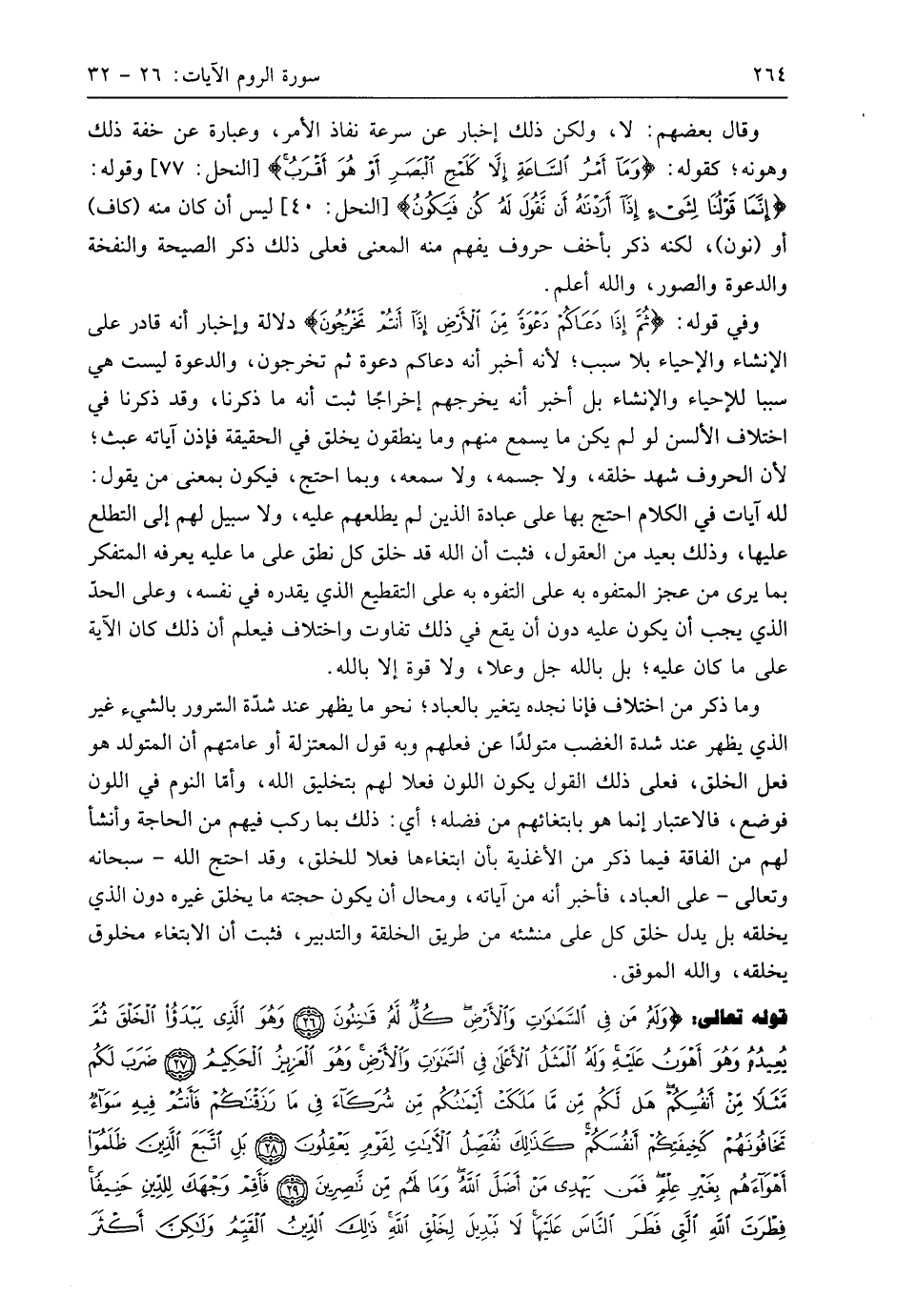قوله تعالى: (وَلَهُ مَنْ فِي السَّمَاوَاتِ وَالْأَرْضِ كُلٌّ لَهُ قَانِتُونَ (26) وَهُوَ الَّذِي يَبْدَأُ الْخَلْقَ ثُمَّ يُعِيدُهُ وَهُوَ أَهْوَنُ عَلَيْهِ وَلَهُ الْمَثَلُ الْأَعْلَى فِي السَّمَاوَاتِ وَالْأَرْضِ وَهُوَ الْعَزِيزُ الْحَكِيمُ (27) ضَرَبَ لَكُمْ مَثَلًا مِنْ أَنْفُسِكُمْ هَلْ لَكُمْ مِنْ مَا مَلَكَتْ أَيْمَانُكُمْ مِنْ شُرَكَاءَ فِي مَا رَزَقْنَاكُمْ فَأَنْتُمْ فِيهِ سَوَاءٌ تَخَافُونَهُمْ كَخِيفَتِكُمْ أَنْفُسَكُمْ كَذَلِكَ نُفَصِّلُ الْآيَاتِ لِقَوْمٍ يَعْقِلُونَ (28) بَلِ اتَّبَعَ الَّذِينَ ظَلَمُوا أَهْوَاءَهُمْ بِغَيْرِ عِلْمٍ فَمَنْ يَهْدِي مَنْ أَضَلَّ اللَّهُ وَمَا لَهُمْ مِنْ نَاصِرِينَ (29) فَأَقِمْ وَجْهَكَ لِلدِّينِ حَنِيفًا فِطْرَتَ اللَّهِ الَّتِي فَطَرَ النَّاسَ عَلَيْهَا لَا تَبْدِيلَ لِخَلْقِ اللَّهِ ذَلِكَ الدِّينُ الْقَيِّمُ وَلَكِنَّ أَكْثَرَ