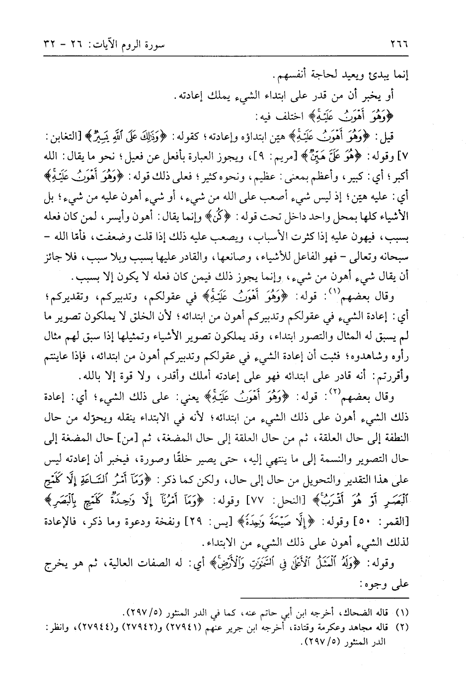 وقَالَ بَعْضُهُمْ: قوله: (وَهُوَ أَهْوَنُ عَلَيْهِ) يعني: على ذلك الشيء؛ أي: إعادة ذلك الشيء أهون على ذلك الشيء من ابتدائه؛ لأنه في الابتداء ينقله ويحوّله من حال النطفة إلى حال العلقة، ثم من حال العلقة إلى حال المضغة، ثم من حال المضغة إلى حال التصوير والنسمة إلى ما ينتهي إليه، حتى يصير خلقًا وصورة، فيخبر أن إعادته ليس على هذا التقدير والتحويل من حال إلى حال، ولكن كما ذكر: (وَمَا أَمْرُ السَّاعَةِ إِلَّا كَلَمْحِ الْبَصَرِ أَوْ هُوَ أَقْرَبُ)، وقوله: (وَمَا أَمْرُنَا إِلَّا وَاحِدَةٌ كَلَمْحٍ بِالْبَصَرِ) وقوله: (إِلَّا صَيْحَةً وَاحِدَةً)، ونفخة ودعوة وما ذكر، فالإعادة لذلك الشيء أهون على ذلك الشيء من الابتداء.
