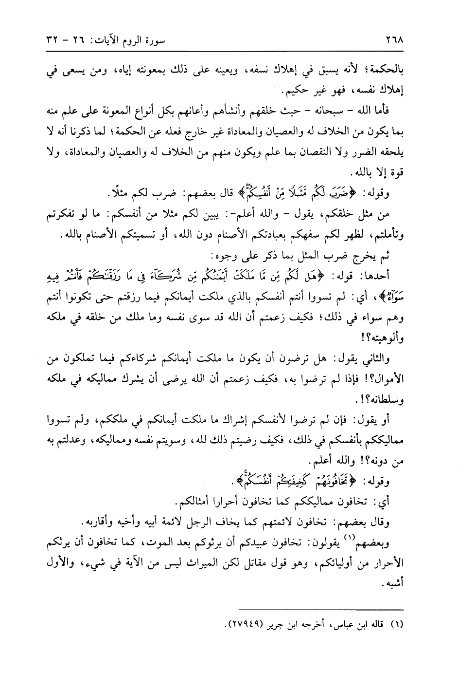 وقوله: (ضَرَبَ لَكُمْ مَثَلًا مِنْ أَنْفُسِكُمْ هَلْ لَكُمْ مِنْ مَا مَلَكَتْ أَيْمَانُكُمْ مِنْ شُرَكَاءَ فِي مَا رَزَقْنَاكُمْ فَأَنْتُمْ فِيهِ سَوَاءٌ تَخَافُونَهُمْ كَخِيفَتِكُمْ أَنْفُسَكُمْ كَذَلِكَ نُفَصِّلُ الْآيَاتِ لِقَوْمٍ يَعْقِلُونَ (28) قَالَ بَعْضُهُمْ: ضرب لكم مثلًا.