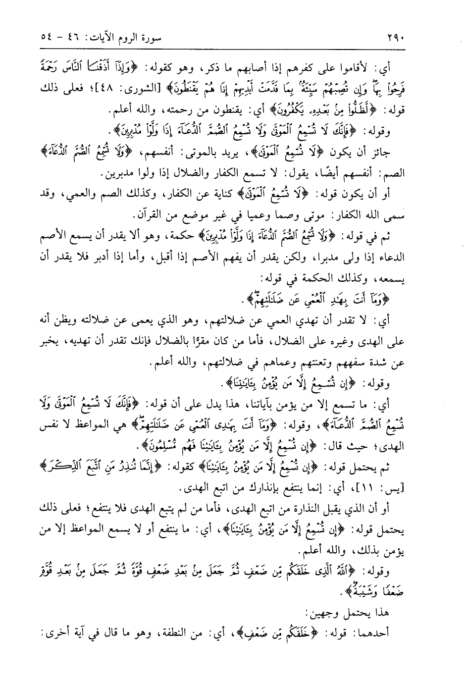 وقوله: (فَإِنَّكَ لَا تُسْمِعُ الْمَوْتَى وَلَا تُسْمِعُ الصُّمَّ الدُّعَاءَ إِذَا وَلَّوْا مُدْبِرِينَ (52) جائز أن يكون (لَا تُسْمِعُ الْمَوْتَى)، يريد بالموتى: أنفسهم، (وَلَا تُسْمِعُ الصُّمَّ الدُّعَاءَ) الصم: أنفسهم أيضا، يقول: لا تسمع الكفار والضلال إذا ولوا مدبرين.
