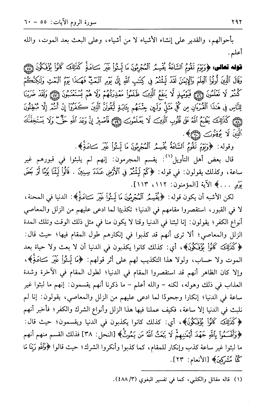 قوله تعالى: (وَيَوْمَ تَقُومُ السَّاعَةُ يُقْسِمُ الْمُجْرِمُونَ مَا لَبِثُوا غَيْرَ سَاعَةٍ كَذَلِكَ كَانُوا يُؤْفَكُونَ (55) وَقَالَ الَّذِينَ أُوتُوا الْعِلْمَ وَالْإِيمَانَ لَقَدْ لَبِثْتُمْ فِي كِتَابِ اللَّهِ إِلَى يَوْمِ الْبَعْثِ فَهَذَا يَوْمُ الْبَعْثِ وَلَكِنَّكُمْ كُنْتُمْ لَا تَعْلَمُونَ (56) فَيَوْمَئِذٍ لَا يَنْفَعُ الَّذِينَ ظَلَمُوا مَعْذِرَتُهُمْ وَلَا هُمْ يُسْتَعْتَبُونَ (57) وَلَقَدْ ضَرَبْنَا لِلنَّاسِ فِي هَذَا الْقُرْآنِ مِنْ كُلِّ مَثَلٍ وَلَئِنْ جِئْتَهُمْ بِآيَةٍ لَيَقُولَنَّ الَّذِينَ كَفَرُوا إِنْ أَنْتُمْ إِلَّا مُبْطِلُونَ (58) كَذَلِكَ يَطْبَعُ اللَّهُ عَلَى قُلُوبِ الَّذِينَ لَا يَعْلَمُونَ (59) فَاصْبِرْ إِنَّ وَعْدَ اللَّهِ حَقٌّ وَلَا يَسْتَخِفَّنَّكَ الَّذِينَ لَا يُوقِنُونَ (60)