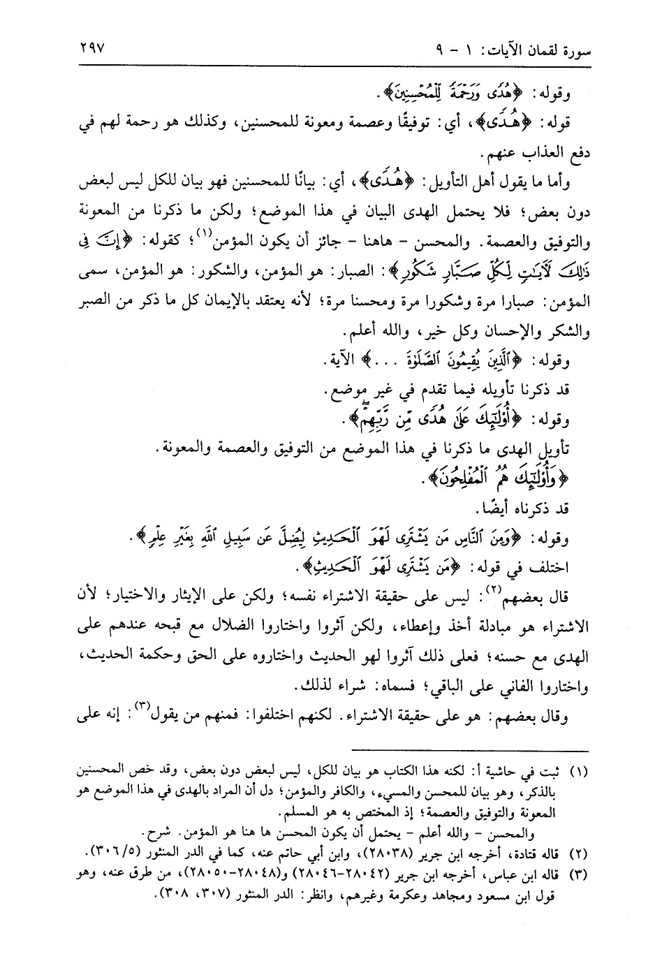 وأما ما يقول أهل التأويل: (هُدًى)، أي: بيانًا للمحسنين فهو بيان للكل ليس لبعض دون بعض؛ فلا يحتمل الهدى البيان في هذا الموضع؛ ولكن ما ذكرنا من المعونة والتوفيق والعصمة. والمحسن - هاهنا - جائز أن يكون المؤمن؛ كقوله: (إِنَّ فِي ذَلِكَ لَآيَاتٍ لِكُلِّ صَبَّارٍ شَكُورٍ): الصبار: هو المؤمن، والشكور: هو المؤمن، سمى المؤمن: صبارا مرة وشكورا مرة ومحسنا مرة؛ لأنه يعتقد بالإيمان كل ما ذكر من الصبر والشكر والإحسان وكل خير، واللَّه أعلم.