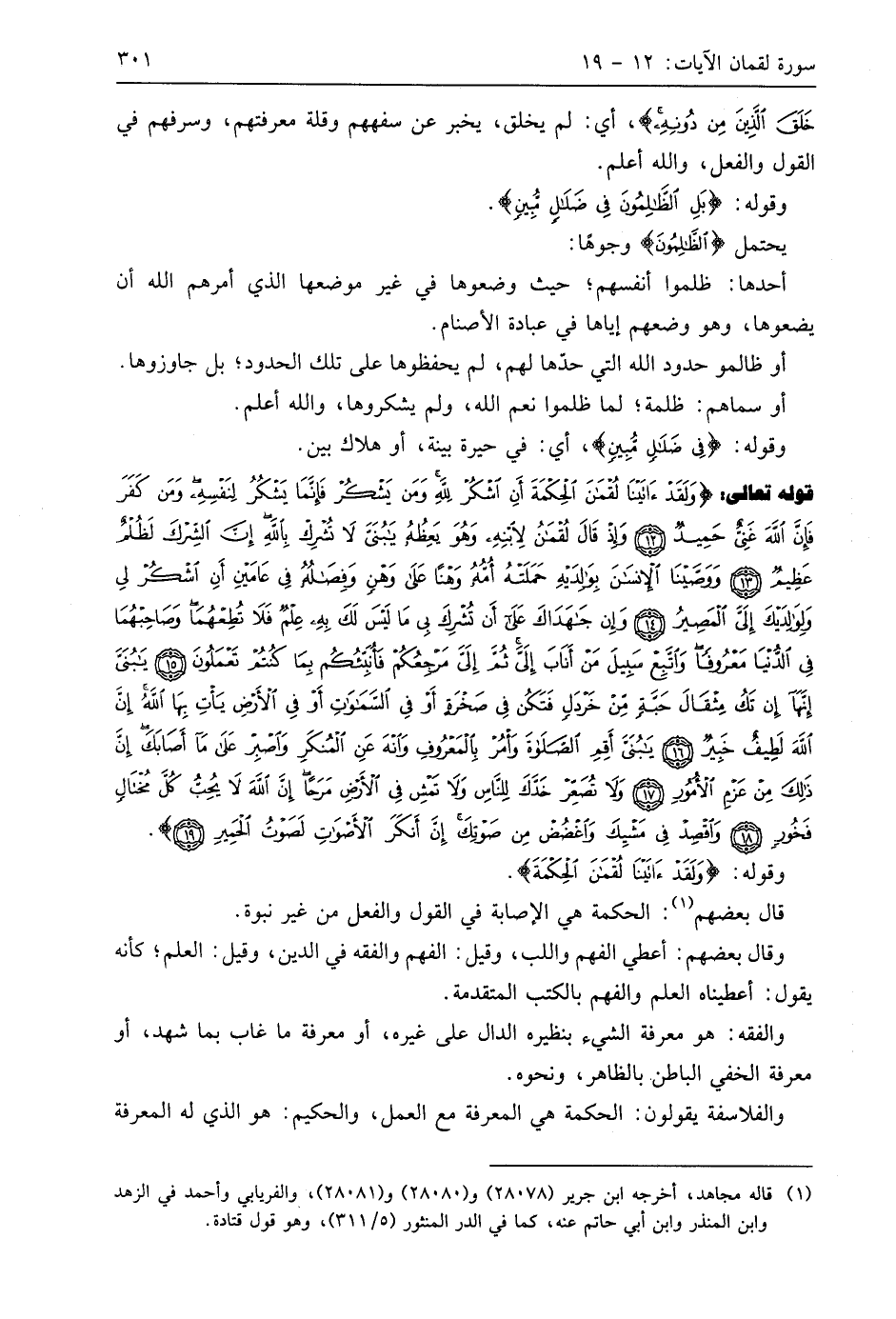 قوله تعالى: (وَلَقَدْ آتَيْنَا لُقْمَانَ الْحِكْمَةَ أَنِ اشْكُرْ لِلَّهِ وَمَنْ يَشْكُرْ فَإِنَّمَا يَشْكُرُ لِنَفْسِهِ وَمَنْ كَفَرَ فَإِنَّ اللَّهَ غَنِيٌّ حَمِيدٌ (12) وَإِذْ قَالَ لُقْمَانُ لِابْنِهِ وَهُوَ يَعِظُهُ يَا بُنَيَّ لَا تُشْرِكْ بِاللَّهِ إِنَّ الشِّرْكَ لَظُلْمٌ عَظِيمٌ (13) وَوَصَّيْنَا الْإِنْسَانَ بِوَالِدَيْهِ حَمَلَتْهُ أُمُّهُ وَهْنًا عَلَى وَهْنٍ وَفِصَالُهُ فِي عَامَيْنِ أَنِ اشْكُرْ لِي وَلِوَالِدَيْكَ إِلَيَّ الْمَصِيرُ (14) وَإِنْ جَاهَدَاكَ عَلَى أَنْ تُشْرِكَ بِي مَا لَيْسَ لَكَ بِهِ عِلْمٌ فَلَا تُطِعْهُمَا وَصَاحِبْهُمَا فِي الدُّنْيَا مَعْرُوفًا وَاتَّبِعْ سَبِيلَ مَنْ أَنَابَ إِلَيَّ ثُمَّ إِلَيَّ مَرْجِعُكُمْ فَأُنَبِّئُكُمْ بِمَا كُنْتُمْ تَعْمَلُونَ (15) يَا بُنَيَّ إِنَّهَا إِنْ تَكُ مِثْقَالَ حَبَّةٍ مِنْ خَرْدَلٍ فَتَكُنْ فِي صَخْرَةٍ أَوْ فِي السَّمَاوَاتِ أَوْ فِي الْأَرْضِ يَأْتِ بِهَا اللَّهُ إِنَّ اللَّهَ لَطِيفٌ خَبِيرٌ (16) يَا بُنَيَّ أَقِمِ الصَّلَاةَ وَأْمُرْ بِالْمَعْرُوفِ وَانْهَ عَنِ الْمُنْكَرِ وَاصْبِرْ عَلَى مَا أَصَابَكَ إِنَّ ذَلِكَ مِنْ عَزْمِ الْأُمُورِ (17) وَلَا تُصَعِّرْ خَدَّكَ لِلنَّاسِ وَلَا تَمْشِ فِي الْأَرْضِ مَرَحًا إِنَّ اللَّهَ لَا يُحِبُّ كُلَّ مُخْتَالٍ فَخُورٍ (18) وَاقْصِدْ فِي مَشْيِكَ وَاغْضُضْ مِنْ صَوْتِكَ إِنَّ أَنْكَرَ الْأَصْوَاتِ لَصَوْتُ الْحَمِيرِ (19)