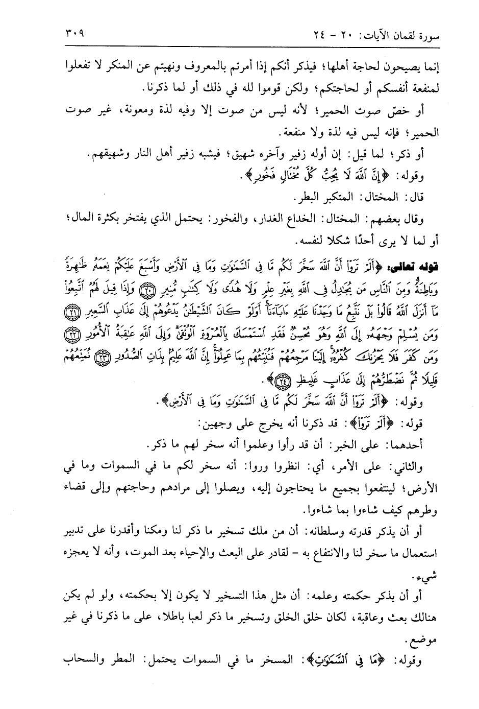 قوله تعالى: (أَلَمْ تَرَوْا أَنَّ اللَّهَ سَخَّرَ لَكُمْ مَا فِي السَّمَاوَاتِ وَمَا فِي الْأَرْضِ وَأَسْبَغَ عَلَيْكُمْ نِعَمَهُ ظَاهِرَةً وَبَاطِنَةً وَمِنَ النَّاسِ مَنْ يُجَادِلُ فِي اللَّهِ بِغَيْرِ عِلْمٍ وَلَا هُدًى وَلَا كِتَابٍ مُنِيرٍ (20) وَإِذَا قِيلَ لَهُمُ اتَّبِعُوا مَا أَنْزَلَ اللَّهُ قَالُوا بَلْ نَتَّبِعُ مَا وَجَدْنَا عَلَيْهِ آبَاءَنَا أَوَلَوْ كَانَ الشَّيْطَانُ يَدْعُوهُمْ إِلَى عَذَابِ السَّعِيرِ (21) وَمَنْ يُسْلِمْ وَجْهَهُ إِلَى اللَّهِ وَهُوَ مُحْسِنٌ فَقَدِ اسْتَمْسَكَ بِالْعُرْوَةِ الْوُثْقَى وَإِلَى اللَّهِ عَاقِبَةُ الْأُمُورِ (22) وَمَنْ كَفَرَ فَلَا يَحْزُنْكَ كُفْرُهُ إِلَيْنَا مَرْجِعُهُمْ فَنُنَبِّئُهُمْ بِمَا عَمِلُوا إِنَّ اللَّهَ عَلِيمٌ بِذَاتِ الصُّدُورِ (23) نُمَتِّعُهُمْ قَلِيلًا ثُمَّ نَضْطَرُّهُمْ إِلَى عَذَابٍ غَلِيظٍ (24)