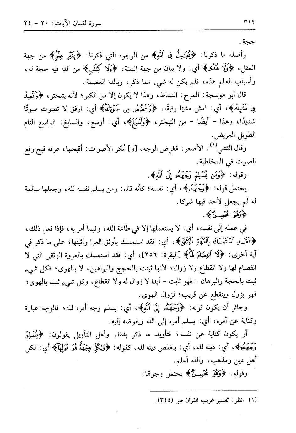 أو يكون كناية عن نفسه؛ فتأويله ما ذكر بدءًا. وأهل التأويل يقولون: (يُسْلِمْ وَجْهَهُ)، أي: دينه لله، أي: يخلص دينه لله، كقوله: (وَلِكُلٍّ وِجْهَةٌ هُوَ مُوَلِّيهَا) أي: لكل أهل دين ومذهب، واللَّه أعلم.