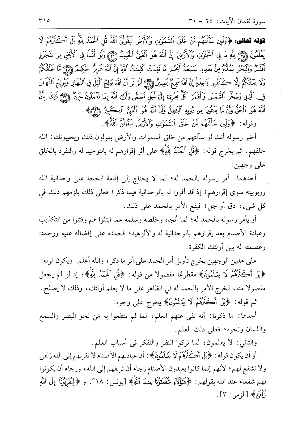 قوله تعالى: (وَلَئِنْ سَأَلْتَهُمْ مَنْ خَلَقَ السَّمَاوَاتِ وَالْأَرْضَ لَيَقُولُنَّ اللَّهُ قُلِ الْحَمْدُ لِلَّهِ بَلْ أَكْثَرُهُمْ لَا يَعْلَمُونَ (25) لِلَّهِ مَا فِي السَّمَاوَاتِ وَالْأَرْضِ إِنَّ اللَّهَ هُوَ الْغَنِيُّ الْحَمِيدُ (26) وَلَوْ أَنَّمَا فِي الْأَرْضِ مِنْ شَجَرَةٍ أَقْلَامٌ وَالْبَحْرُ يَمُدُّهُ مِنْ بَعْدِهِ سَبْعَةُ أَبْحُرٍ مَا نَفِدَتْ كَلِمَاتُ اللَّهِ إِنَّ اللَّهَ عَزِيزٌ حَكِيمٌ (27) مَا خَلْقُكُمْ وَلَا بَعْثُكُمْ إِلَّا كَنَفْسٍ وَاحِدَةٍ إِنَّ اللَّهَ سَمِيعٌ بَصِيرٌ (28) أَلَمْ تَرَ أَنَّ اللَّهَ يُولِجُ اللَّيْلَ فِي النَّهَارِ وَيُولِجُ النَّهَارَ فِي اللَّيْلِ وَسَخَّرَ الشَّمْسَ وَالْقَمَرَ كُلٌّ يَجْرِي إِلَى أَجَلٍ مُسَمًّى وَأَنَّ اللَّهَ بِمَا تَعْمَلُونَ خَبِيرٌ (29) ذَلِكَ بِأَنَّ اللَّهَ هُوَ الْحَقُّ وَأَنَّ مَا يَدْعُونَ مِنْ دُونِهِ الْبَاطِلُ وَأَنَّ اللَّهَ هُوَ الْعَلِيُّ الْكَبِيرُ (30)
