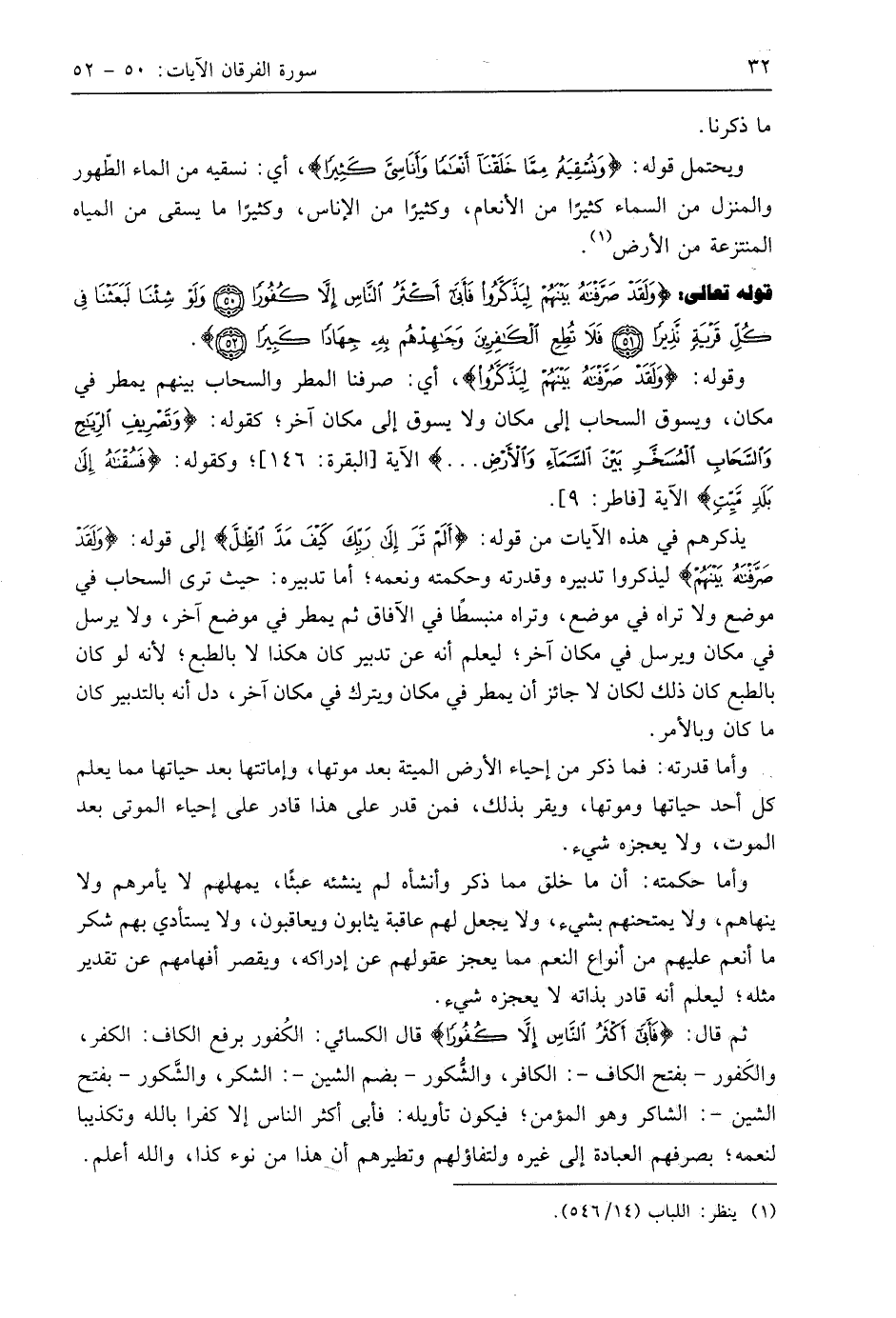 ثم قال: (فَأَبَى أَكْثَرُ النَّاسِ إِلَّا كُفُورًا) قال الكسائي: الكُفور برفع الكاف: الكفر، والكَفور -بفتح الكاف-: الكافر، والشُّكور -بضم الشين-: الشكر، والشَّكور -بفتح الشين-: الشاكر وهو المؤمن؛ فيكون تأويله: فأبي أكثر الناس إلا كفرا باللَّه وتكذيبا لنعمه؛ بصرفهم العبادة إلى غيره ولتفاؤلهم وتطيرهم أن هذا من نوء كذا، واللَّه أعلم.