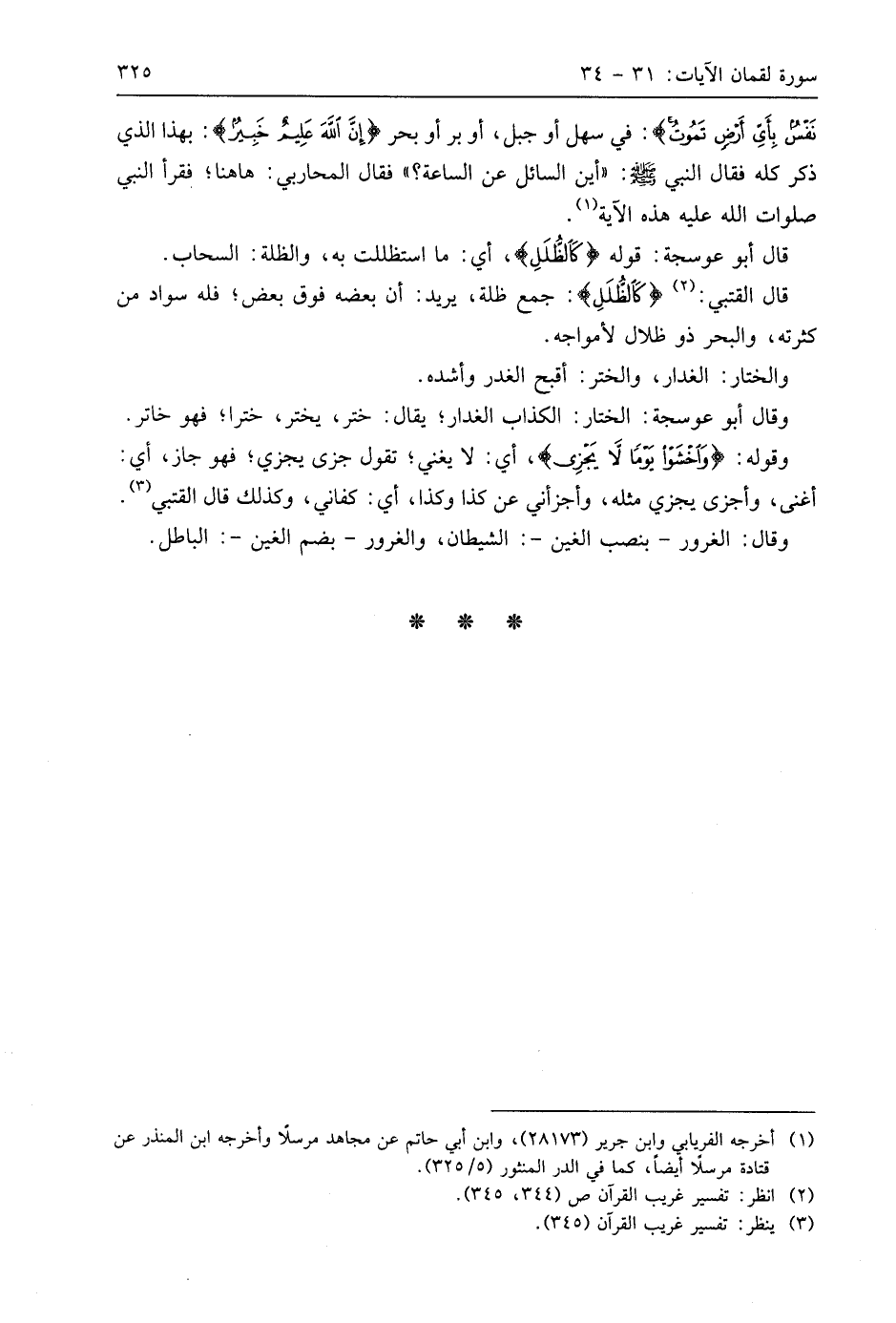 وقال: الغرور - بنصب الغين -: الشيطان، والغرور - بضم الغين -: الباطل.