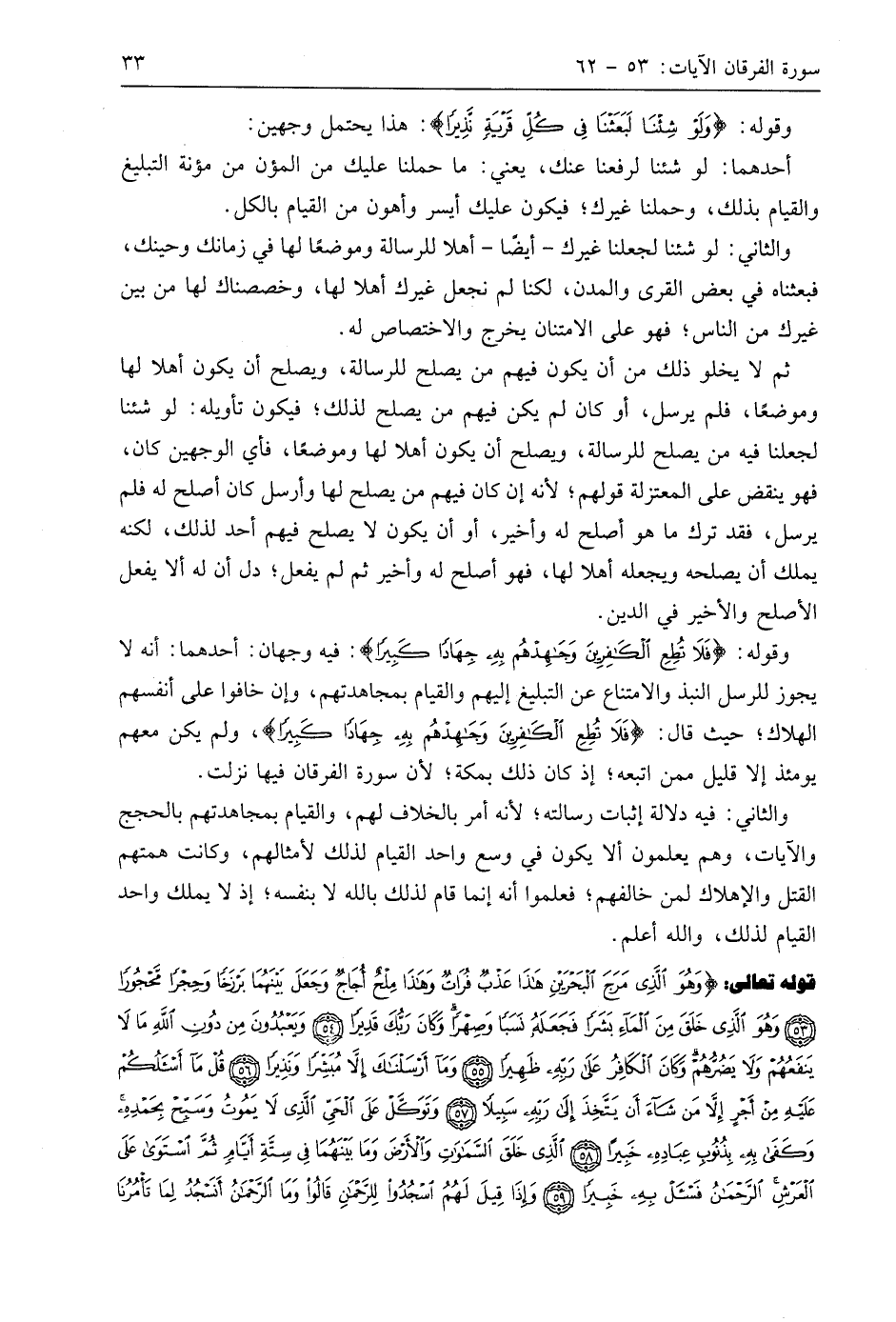 وقوله: (فَلَا تُطِعِ الْكَافِرِينَ وَجَاهِدْهُمْ بِهِ جِهَادًا كَبِيرًا (52) فيه وجهان: أحدهما: أنه لا يجوز للرسل النبذ والامتناع عن التبليغ إليهم والقيام بمجاهدتهم، وإن خافوا على أنفسهم الهلاك؛ حيث قال: (فَلَا تُطِعِ الْكَافِرِينَ وَجَاهِدْهُمْ بِهِ جِهَادًا كَبِيرًا)، ولم يكن معهم يومئذ إلا قليل ممن اتبعه؛ إذ كان ذلك بمكة؛ لأن سورة الفرقان فيها نزلت.