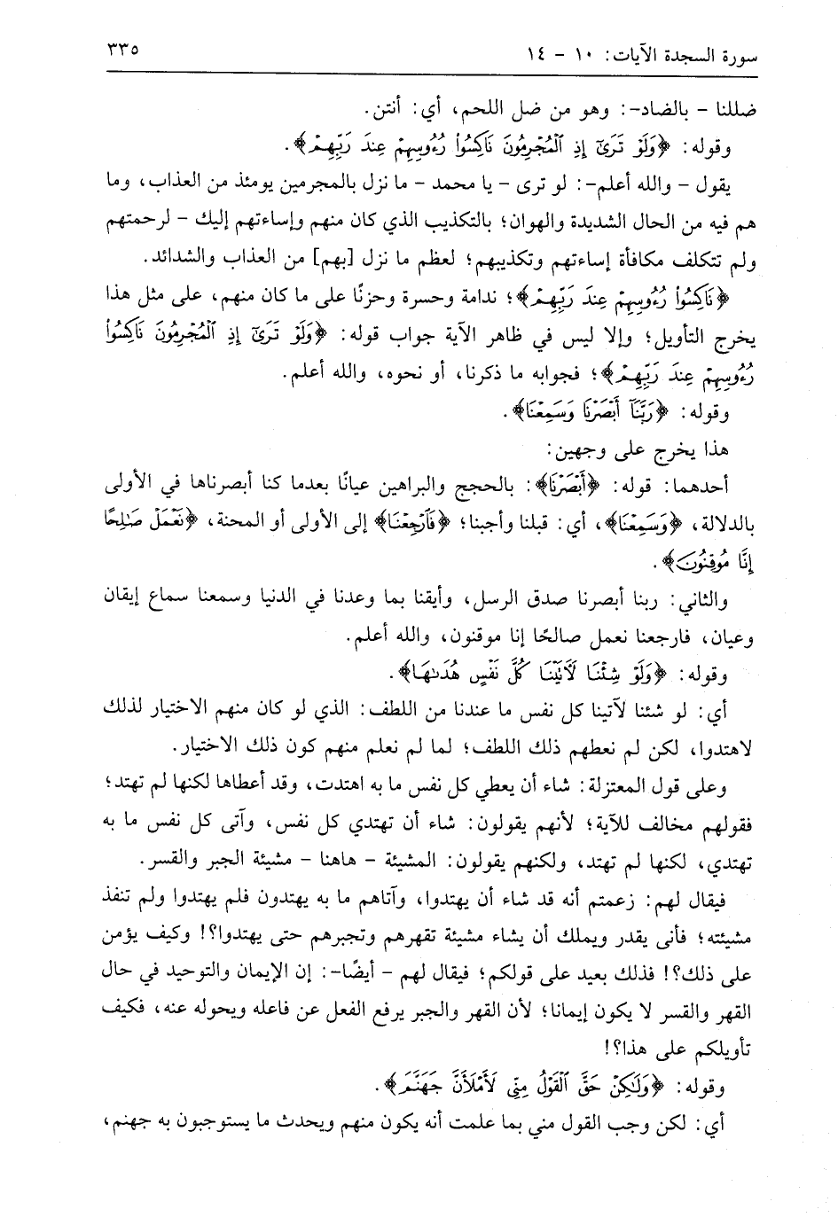 وعلى قول المعتزلة: شاء أن يعطي كل نفس ما به اهتدت، وقد أعطاها لكنها لم تهتد؛ فقولهم مخالف للآية؛ لأنهم يقولون: شاء أن تهتدي كل نفس، وآتى كل نفس ما به تهتدي، لكنها لم تهتد، ولكنهم يقولون: المشيئة - هاهنا - مشيئة الجبر والقسر.