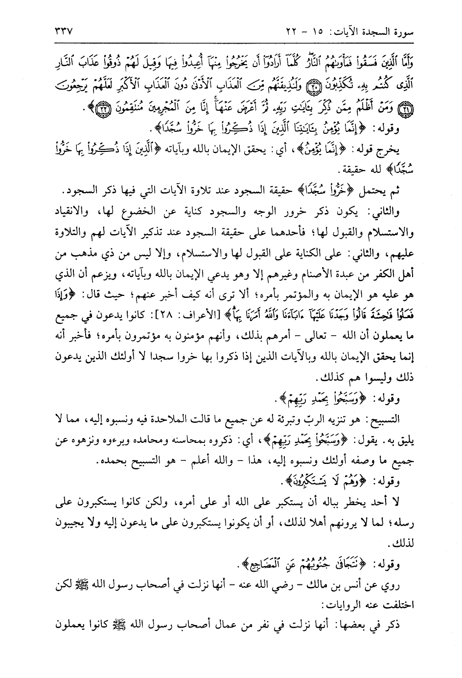 وقوله: (إِنَّمَا يُؤْمِنُ بِآيَاتِنَا الَّذِينَ إِذَا ذُكِّرُوا بِهَا خَرُّوا سُجَّدًا ... (15)