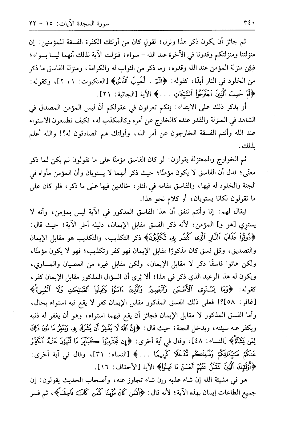 ثم الخوارج والمعتزلة يقولون: لو كان الفاسق مؤمنًا على ما تقولون لم يكن لما ذكر معنًى؛ فدل أن الفاسق لا يكون مؤمنًا؛ حيث ذكر أنهما لا يستويان وأن المؤمن مأواه في الجنة والخلود له فيها، والفاسق مقامه في النار، خالدين فيها على ما ذكر، فلو كان على ما تقولون لكانا يستويان، أو كلام نحو هذا.