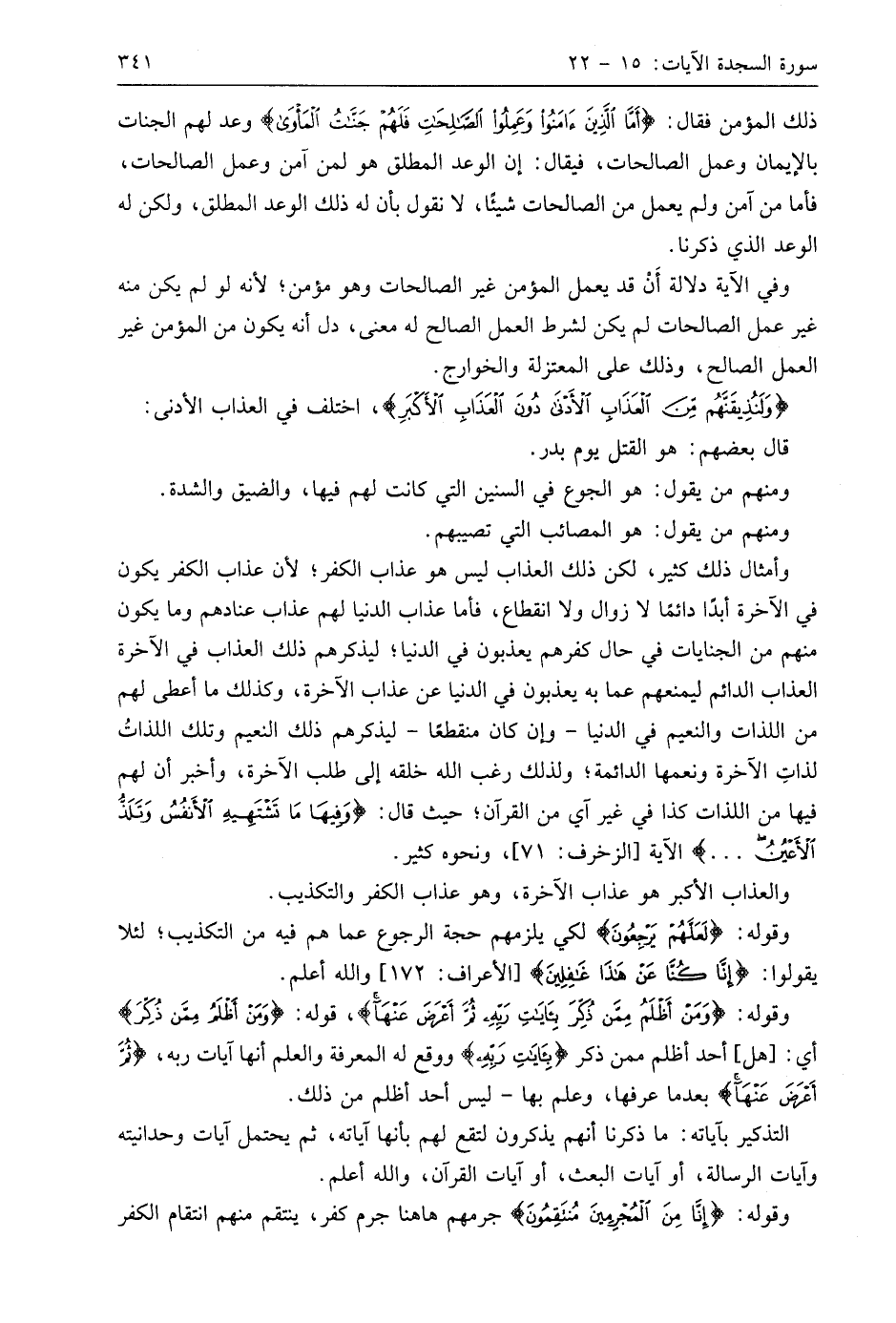 ذلك المؤمن فقال: (أَمَّا الَّذِينَ آمَنُوا وَعَمِلُوا الصَّالِحَاتِ فَلَهُمْ جَنَّاتُ الْمَأْوَى نُزُلًا بِمَا كَانُوا يَعْمَلُونَ (19) وعد لهم الجنات بالإيمان وعمل الصالحات، فيقال: إن الوعد المطلق هو لمن آمن وعمل الصالحات، فأما من آمن ولم يعمل من الصالحات شيئًا، لا نقول بأن له ذلك الوعد المطلق، ولكن له الوعد الذي ذكرنا.