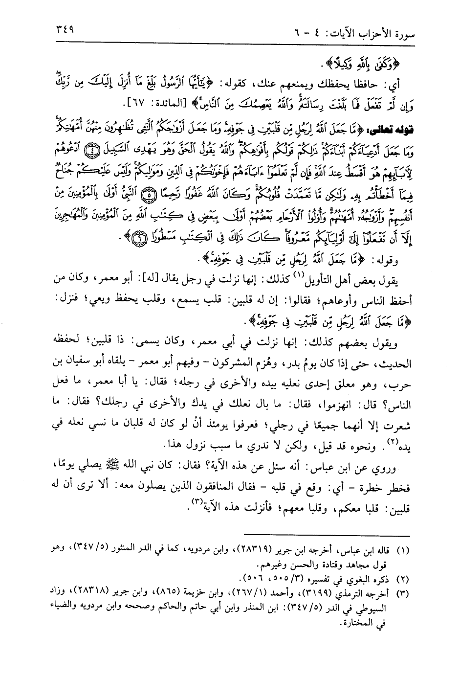قوله تعالى: (مَا جَعَلَ اللَّهُ لِرَجُلٍ مِنْ قَلْبَيْنِ فِي جَوْفِهِ وَمَا جَعَلَ أَزْوَاجَكُمُ اللَّائِي تُظَاهِرُونَ مِنْهُنَّ أُمَّهَاتِكُمْ وَمَا جَعَلَ أَدْعِيَاءَكُمْ أَبْنَاءَكُمْ ذَلِكُمْ قَوْلُكُمْ بِأَفْوَاهِكُمْ وَاللَّهُ يَقُولُ الْحَقَّ وَهُوَ يَهْدِي السَّبِيلَ (4) ادْعُوهُمْ لِآبَائِهِمْ هُوَ أَقْسَطُ عِنْدَ اللَّهِ فَإِنْ لَمْ تَعْلَمُوا آبَاءَهُمْ فَإِخْوَانُكُمْ فِي الدِّينِ وَمَوَالِيكُمْ وَلَيْسَ عَلَيْكُمْ جُنَاحٌ فِيمَا أَخْطَأْتُمْ بِهِ وَلَكِنْ مَا تَعَمَّدَتْ قُلُوبُكُمْ وَكَانَ اللَّهُ غَفُورًا رَحِيمًا (5) النَّبِيُّ أَوْلَى بِالْمُؤْمِنِينَ مِنْ أَنْفُسِهِمْ وَأَزْوَاجُهُ أُمَّهَاتُهُمْ وَأُولُو الْأَرْحَامِ بَعْضُهُمْ أَوْلَى بِبَعْضٍ فِي كِتَابِ اللَّهِ مِنَ الْمُؤْمِنِينَ وَالْمُهَاجِرِينَ إِلَّا أَنْ تَفْعَلُوا إِلَى أَوْلِيَائِكُمْ مَعْرُوفًا كَانَ ذَلِكَ فِي الْكِتَابِ مَسْطُورًا (6)