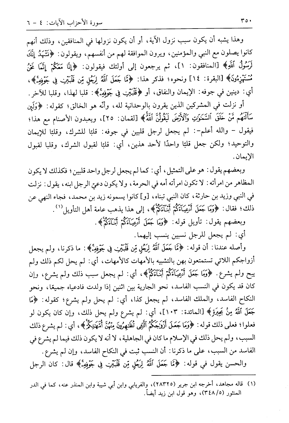 وأصله عندنا: أن قوله: (مَا جَعَلَ اللَّهُ لِرَجُلٍ مِنْ قَلْبَيْنِ فِي جَوْفِهِ): ما ذكرنا، ولم يجعل أزواجكم اللائي تستمتعون بهن بالتشبيه بالأمهات كالأمهات، أي: لم يحل لكم ذلك ولم يبح ولم يشرع. (وَمَا جَعَلَ أَدْعِيَاءَكُمْ أَبْنَاءَكُمْ)، أي: لم يجعل سبب ذلك ولم يشرع، وإن كان قد يكون في النسب الفاسد، نحو الجارية بين اثنين إذا ولدت فادعياه جميعًا، ونحو النكاح الفاسد، والملك الفاسد، لم يجعل كذا، أي: لم يحل ولم يشرع؛ كقوله: (مَا جَعَلَ اللَّهُ مِنْ بَحِيرَةٍ)، أي: لم يشرع ولم يحل ذلك، وإن كان يكون لو فعلوا؛ فعلى ذلك قوله: (وَمَا جَعَلَ أَزْوَاجَكُمُ اللَّائِي تُظَاهِرُونَ مِنْهُنَّ أُمَّهَاتِكُمْ)، أي: لم يشرع ذلك السبب، ولم يحل ذلك في الإسلام ما كان في الجاهلية، لا أنه لا يكون ذلك فيما لم يشرع في الفاسد من السبب، على ما ذكرنا: أن النسب ثبت في النكاح الفاسد، وإن لم يشرع.