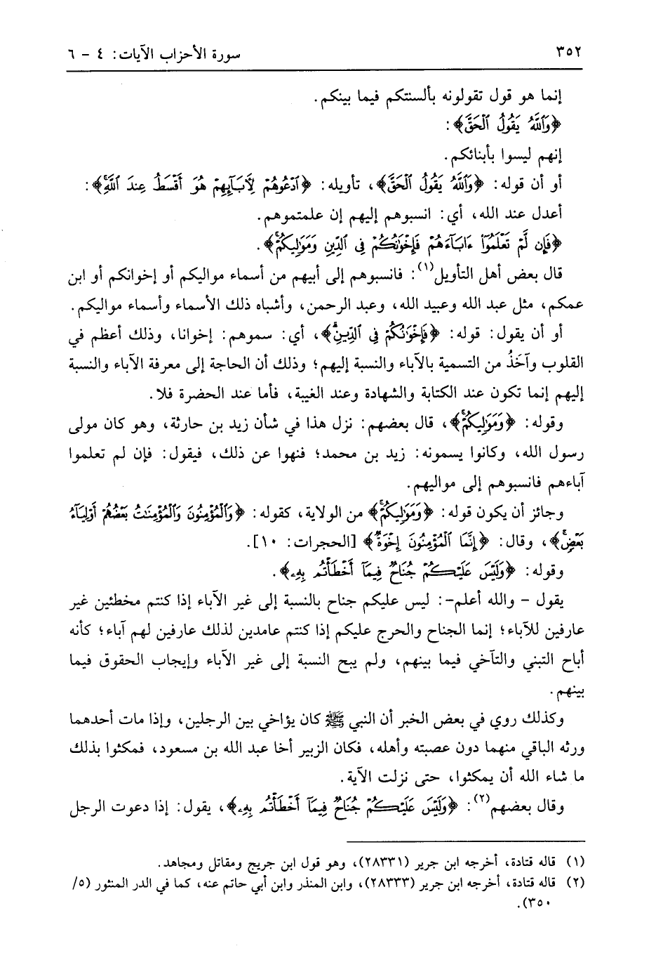 أو أن قوله: (وَاللَّهُ يَقُولُ الْحَقَّ)، تأويله: (ادْعُوهُمْ لِآبَائِهِمْ هُوَ أَقْسَطُ عِنْدَ اللَّهِ (5): أعدل عند اللَّه، أي: انسبوهم إليهم إن علمتموهم.