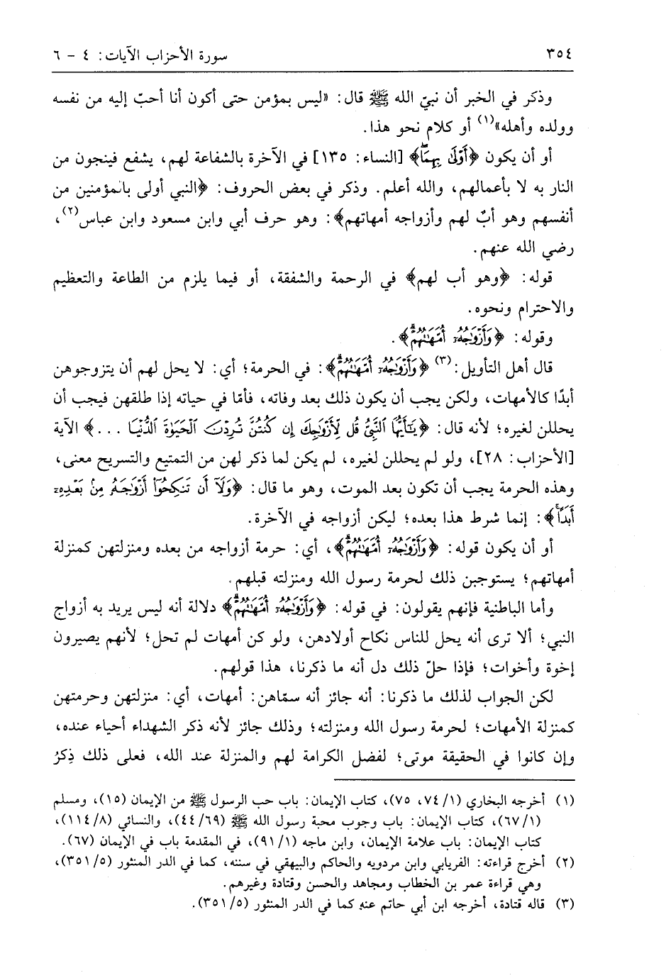قال أهل التأويل: (وَأَزْوَاجُهُ أُمَّهَاتُهُمْ): في الحرمة؛ أي: لا يحل لهم أن يتزوجوهن أبدًا كالأمهات، ولكن يجب أن يكون ذلك بعد وفاته، فأمَّا في حياته إذا طلقهن فيجب أن يحللن لغيره؛ لأنه قال: (يَا أَيُّهَا النَّبِيُّ قُلْ لِأَزْوَاجِكَ إِنْ كُنْتُنَّ تُرِدْنَ الْحَيَاةَ الدُّنْيَا. . .) الآية، ولو لم يحللن لغيره، لم يكن لما ذكر لهن من التمتيع والتسريح معنى، وهذه الحرمة يجب أن تكون بعد الموت، وهو ما قال: (وَلَا أَنْ تَنْكِحُوا أَزْوَاجَهُ مِنْ بَعْدِهِ أَبَدًا): إنما شرط هذا بعده؛ ليكن أزواجه في الآخرة.