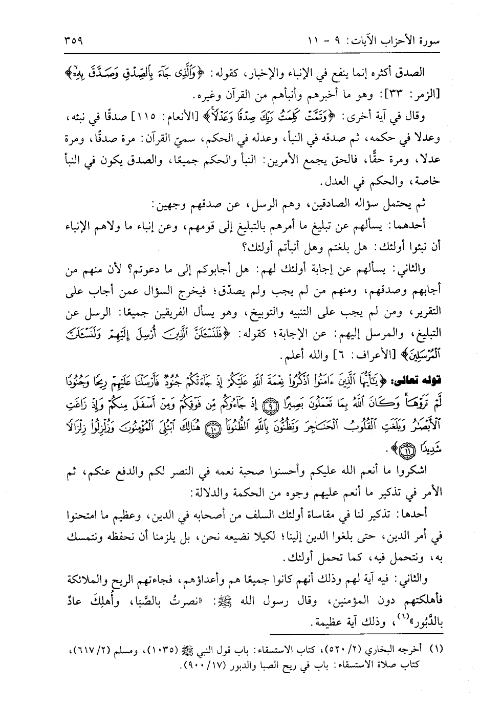 [(يَا أَيُّهَا الَّذِينَ آمَنُوا اذْكُرُوا نِعْمَةَ اللَّهِ عَلَيْكُمْ إِذْ جَاءَتْكُمْ جُنُودٌ فَأَرْسَلْنَا عَلَيْهِمْ رِيحًا وَجُنُودًا لَمْ تَرَوْهَا)] اشكروا ما أنعم اللَّه عليكم وأحسنوا صحبة نعمه في النصر لكم والدفع عنكم، ثم الأمر في تذكير ما أنعم عليهم وجوه من الحكمة والدلالة: