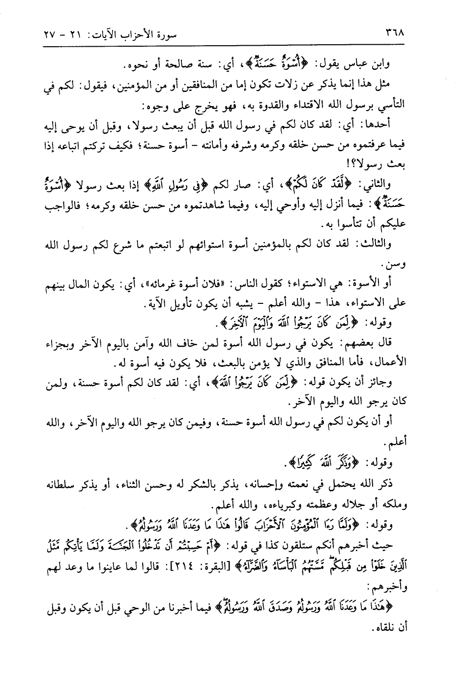 والثاني: (لَقَدْ كَانَ لَكُمْ)، أي: صار لكم (فِي رَسُولِ اللَّهِ) إذا بعث رسولا (أُسْوَةٌ حَسَنَةٌ): فيما أنزل إليه وأوحي إليه، وفيما شاهدتموه من حسن خلقه وكرمه؛ فالواجب عليكم أن تتاسوا به.
