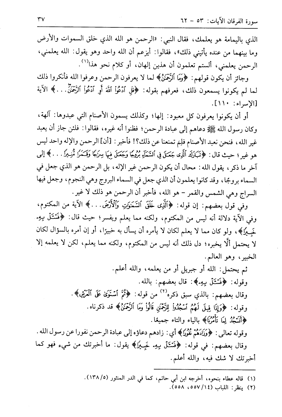 أو أن يكونوا يعرفون كل معبود: إلها؛ وكذلك يسمون الأصنام التي عبدوها: آلهة، وكان رسول اللَّه - صَلَّى اللَّهُ عَلَيهِ وَسَلَّمَ - دعاهم إلى عبادة الرحمن؛ فظنوا أنه غيره، فقالوا: فلئن جاز أن يعبد غير اللَّه، فنحن نعبد الأصنام فلِمَ تمنعنا عن ذلك؟! فأخبر: أن الرحمن والإله واحد ليس هو غير؛ حيث قال: (تَبَارَكَ الَّذِي جَعَلَ فِي السَّمَاءِ بُرُوجًا وَجَعَلَ فِيهَا سِرَاجًا وَقَمَرًا مُنِيرًا. . .) إلى آخر ما ذكر، يقول اللَّه: محال أن يكون الرحمن غير الإله، بل الرحمن هو الذي جعل في السماء بروجًا، وقد كانوا يعلمون أن الذي جعل في السماء البروج وهي النجوم، وجعل فيها السراج وهي الشمس والقمر - هو اللَّه، فأخبر أن الرحمن هو ذلك لا غير.