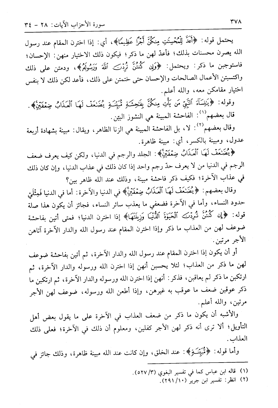أو أن يكون إذا اخترن المقام عند رسول اللَّه والدار الآخرة، ثم أتين بفاحشة ضوعف لهن ما ذكر من العذاب؛ لئلا يحسبن أنهن إذا اخترن اللَّه ورسوله والدار الآخرة، ثم ارتكبن ما ذكر لم يعاقبن، فذكر: أنهن إذا اخترن اللَّه ورسوله والدار الآخرة، ثم ارتكبن ما ذكر عوقبن ضعف ما عوقب به غيرهن، وإذا أطعن اللَّه ورسوله، ضوعف لهن الأجر مرتين، واللَّه أعلم.