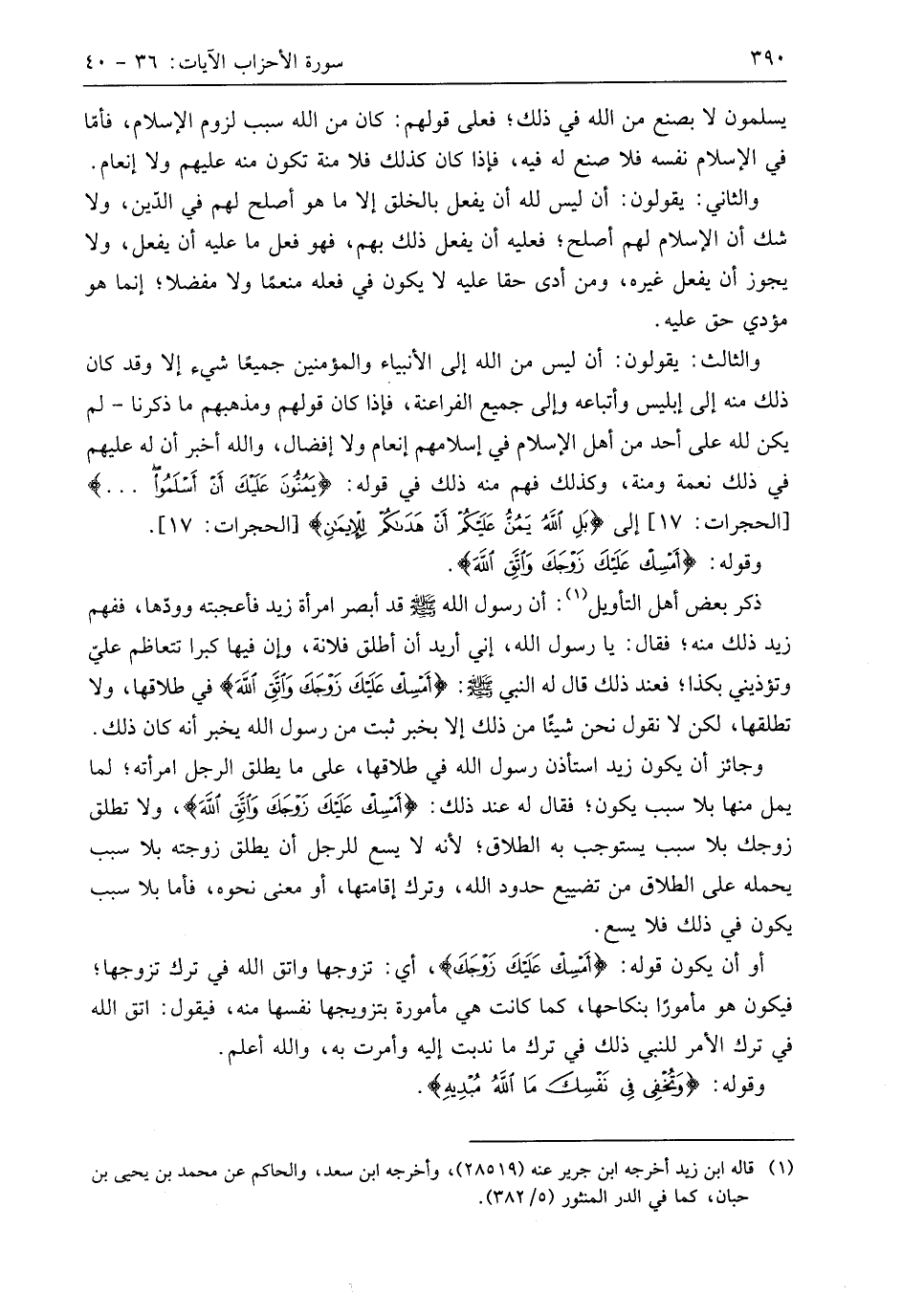 ذكر بعض أهل التأويل: أن رسول اللَّه - صَلَّى اللَّهُ عَلَيهِ وَسَلَّمَ - قد أبصر امرأة زيد فأعجبته وودَّها، ففهم زيد ذلك منه؛ فقال: يا رسول اللَّه، إني أريد أن أطلق فلانة، وإن فيها كبرا تتعاظم عليَّ وتؤذيني بكذا؛ فعند ذلك قال له النبي - صَلَّى اللَّهُ عَلَيهِ وَسَلَّمَ -: (أَمْسِكْ عَلَيْكَ زَوْجَكَ وَاتَّقِ اللَّهَ) في طلاقها، ولا تطلقها، لكن لا نقول نحن شيئًا من ذلك إلا بخبر ثبت من رسول اللَّه - صَلَّى اللَّهُ عَلَيهِ وَسَلَّمَ - يخبر أنه كان ذلك.
