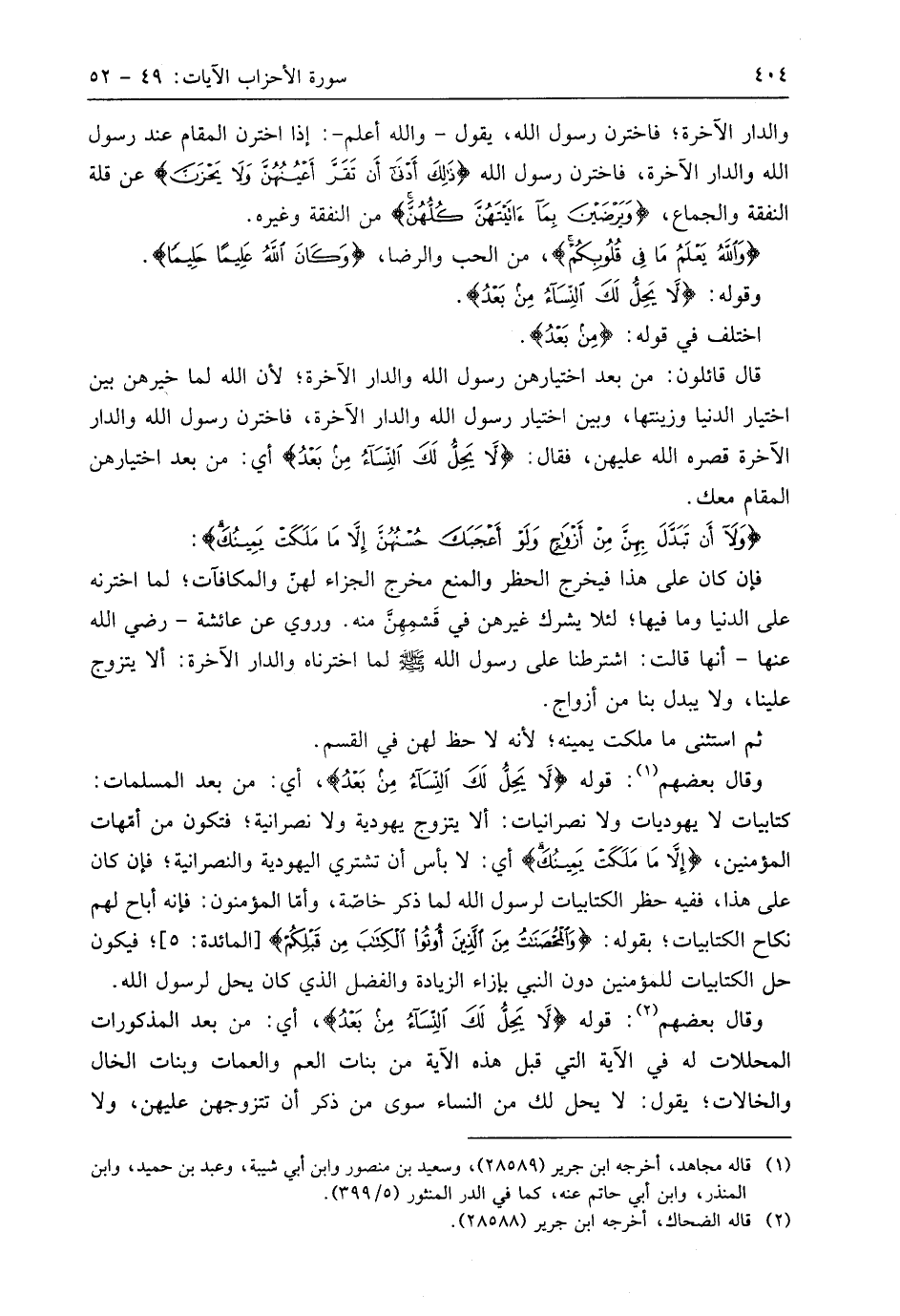 قال قائلون: من بعد اختيارهن رسول اللَّه والدار الآخرة؛ لأن اللَّه لما خيرهن بين اختيار الدنيا وزينتها، وبين اختيار رسول اللَّه والدار الآخرة، فاخترن رسول اللَّه والدار الآخرة قصره اللَّه عليهن، فقال: (لَا يَحِلُّ لَكَ النِّسَاءُ مِنْ بَعْدُ) أي: من بعد اختيارهن المقام معك.
