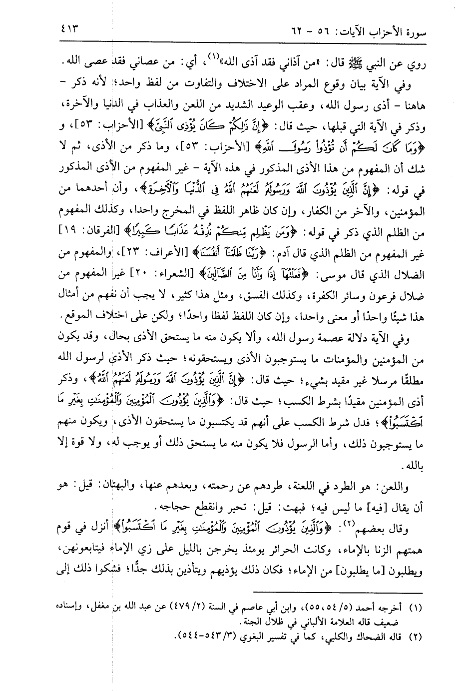 وفي الآية بيان وقوع المراد على الاختلاف والتفاوت من لفظ واحد؛ لأنه ذكر - هاهنا - أذى رسول اللَّه، وعقب الوعيد الشديد من اللعن والعذاب في الدنيا والآخرة، وذكر في الآية التي قبلها، حيث قال: (إِنَّ ذَلِكُمْ كَانَ يُؤْذِي النَّبِيَّ)، و (وَمَا كَانَ لَكُمْ أَنْ تُؤْذُوا رَسُولَ اللَّهِ)، وما ذكر من الأذى، ثم لا شك أن المفهوم من هذا الأذى المذكور في هذه الآية - غير المفهوم من الأذى المذكور في قوله: (إِنَّ الَّذِينَ يُؤْذُونَ اللَّهَ وَرَسُولَهُ لَعَنَهُمُ اللَّهُ فِي الدُّنْيَا وَالْآخِرَةِ)، وأن أحدهما من المؤمنين، والآخر من الكفار، وإن كان ظاهر اللفظ في المخرج واحدا، وكذلك المفهوم من الظلم الذي ذكر في قوله: (وَمَنْ يَظْلِمْ مِنْكُمْ نُذِقْهُ عَذَابًا كَبِيرًا)، غير المفهوم من الظلم الذي قال آدم: (رَبَّنَا ظَلَمْنَا أَنْفُسَنَا)، والمفهوم من الضلال الذي قال موسى: (فَعَلْتُهَا إِذًا وَأَنَا مِنَ الضَّالِّينَ)، غير المفهوم من ضلال فرعون وسائر الكفرة، وكذلك الفسق، ومثل هذا كثير، لا يجب أن نفهم من أمثال هذا شيئًا واحدًا أو معنى واحدا، وإن كان اللفظ لفظا واحدًا؛ ولكن على اختلاف الموقع.