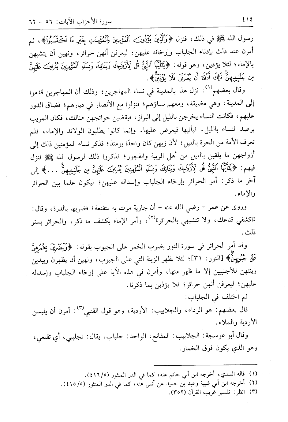 رسول اللَّه - صَلَّى اللَّهُ عَلَيهِ وَسَلَّمَ - في ذلك، فنزل (وَالَّذِينَ يُؤْذُونَ الْمُؤْمِنِينَ وَالْمُؤْمِنَاتِ بِغَيْرِ مَا اكْتَسَبُوا)، ثم أمرن عند ذلك بإدناء الجلباب وإرخائه عليهن؛ ليعرفن أنهن حرائر، ونهين أن يتشبهن بالإماء؛ لئلا يؤذين، وهو قوله: (يَا أَيُّهَا النَّبِيُّ قُلْ لِأَزْوَاجِكَ وَبَنَاتِكَ وَنِسَاءِ الْمُؤْمِنِينَ يُدْنِينَ عَلَيْهِنَّ مِنْ جَلَابِيبِهِنَّ ذَلِكَ أَدْنَى أَنْ يُعْرَفْنَ فَلَا يُؤْذَيْنَ وَكَانَ اللَّهُ غَفُورًا رَحِيمًا (59)
