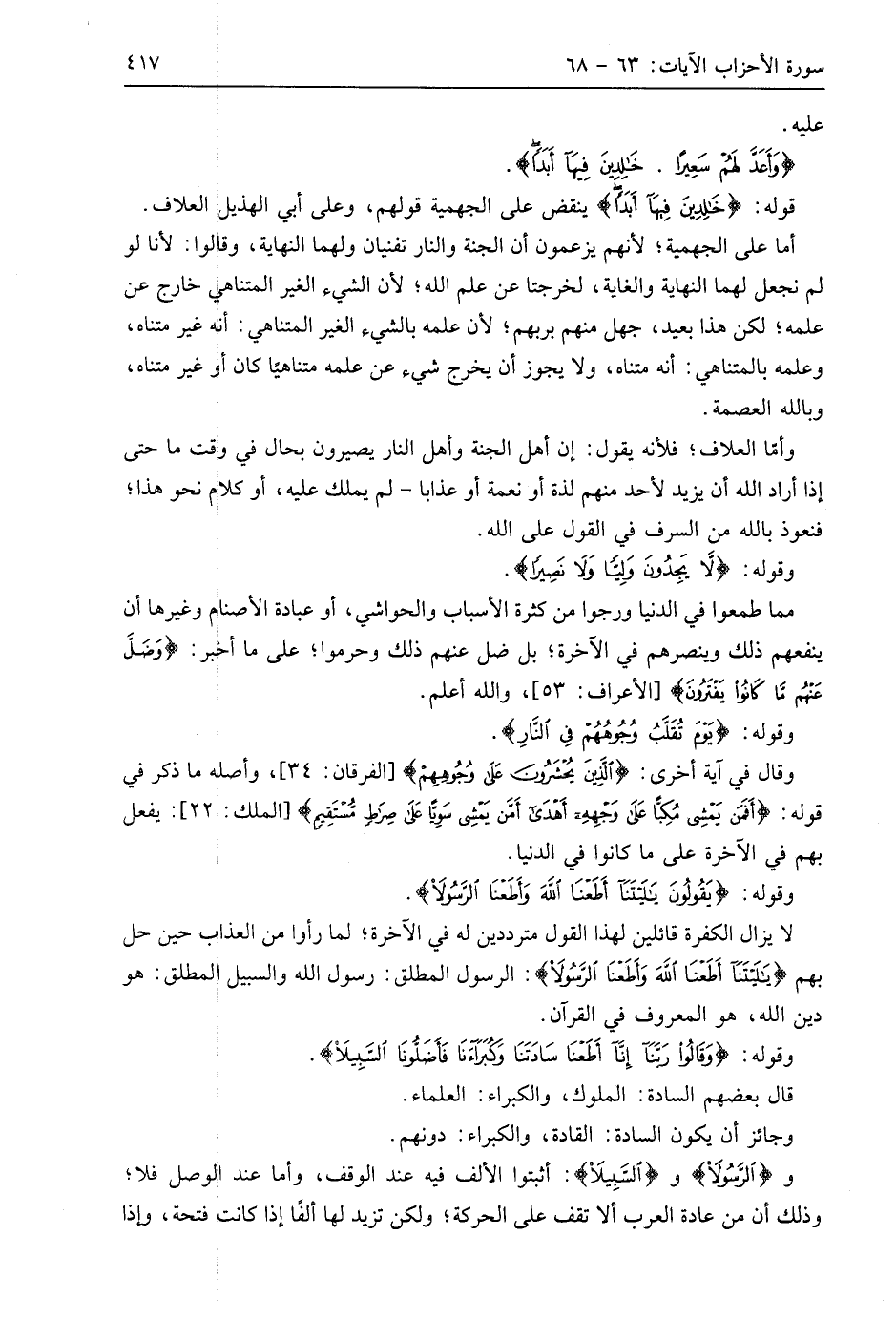 قوله: (خَالِدِينَ فِيهَا أَبَدًا لَا يَجِدُونَ وَلِيًّا وَلَا نَصِيرًا (65) ينقض على الجهمية قولهم، وعلى أبي الهذيل العلاف.