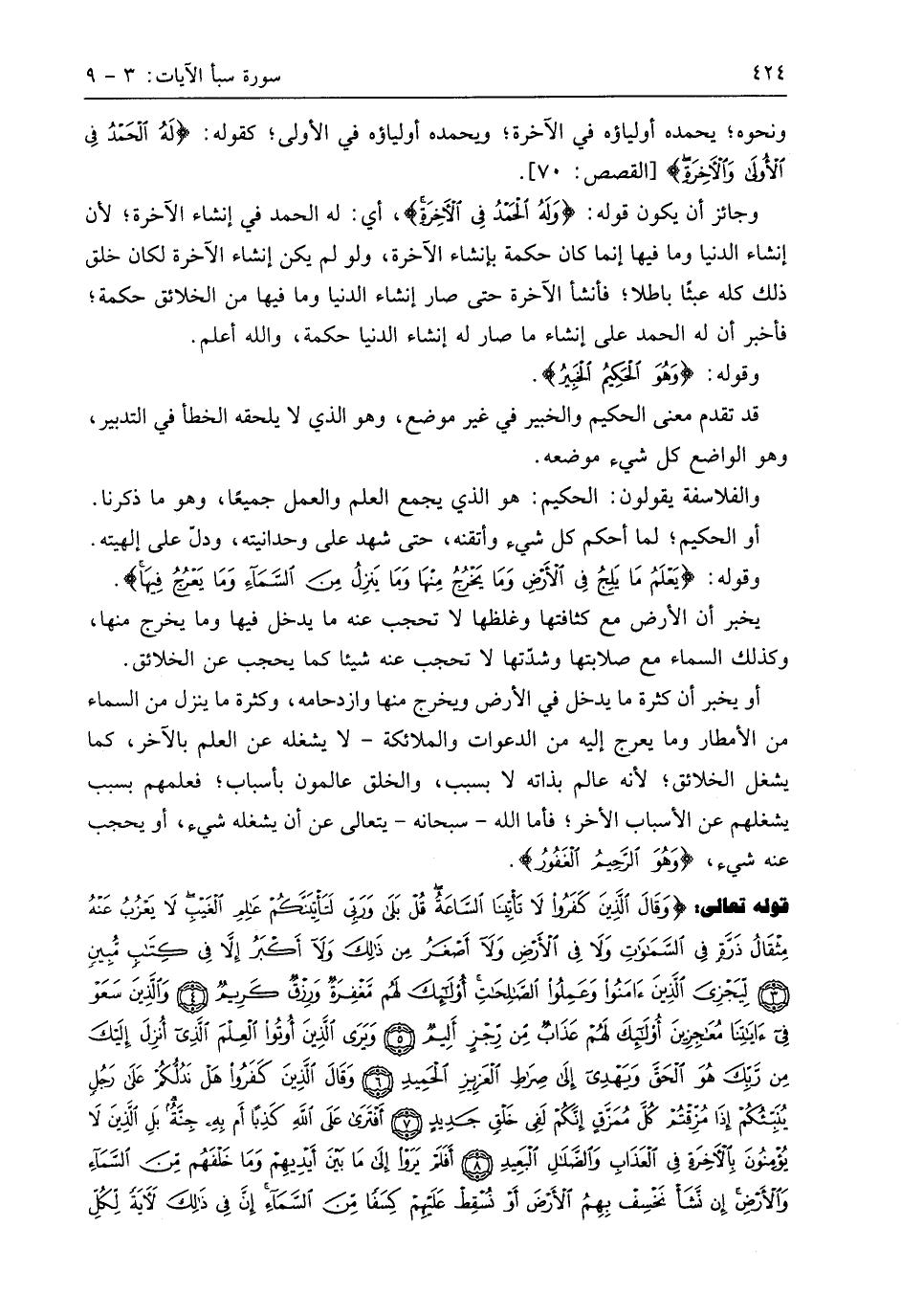 قوله تعالى: (وَقَالَ الَّذِينَ كَفَرُوا لَا تَأْتِينَا السَّاعَةُ قُلْ بَلَى وَرَبِّي لَتَأْتِيَنَّكُمْ عَالِمِ الْغَيْبِ لَا يَعْزُبُ عَنْهُ مِثْقَالُ ذَرَّةٍ فِي السَّمَاوَاتِ وَلَا فِي الْأَرْضِ وَلَا أَصْغَرُ مِنْ ذَلِكَ وَلَا أَكْبَرُ إِلَّا فِي كِتَابٍ مُبِينٍ (3) لِيَجْزِيَ الَّذِينَ آمَنُوا وَعَمِلُوا الصَّالِحَاتِ أُولَئِكَ لَهُمْ مَغْفِرَةٌ وَرِزْقٌ كَرِيمٌ (4) وَالَّذِينَ سَعَوْا فِي آيَاتِنَا مُعَاجِزِينَ أُولَئِكَ لَهُمْ عَذَابٌ مِنْ رِجْزٍ أَلِيمٌ (5) وَيَرَى الَّذِينَ أُوتُوا الْعِلْمَ الَّذِي أُنْزِلَ إِلَيْكَ مِنْ رَبِّكَ هُوَ الْحَقَّ وَيَهْدِي إِلَى صِرَاطِ الْعَزِيزِ الْحَمِيدِ (6) وَقَالَ الَّذِينَ كَفَرُوا هَلْ نَدُلُّكُمْ عَلَى رَجُلٍ يُنَبِّئُكُمْ إِذَا مُزِّقْتُمْ كُلَّ مُمَزَّقٍ إِنَّكُمْ لَفِي خَلْقٍ جَدِيدٍ (7) فْتَرَى عَلَى اللَّهِ كَذِبًا أَمْ بِهِ جِنَّةٌ بَلِ الَّذِينَ لَا يُؤْمِنُونَ بِالْآخِرَةِ فِي الْعَذَابِ وَالضَّلَالِ الْبَعِيدِ (8) أَفَلَمْ يَرَوْا إِلَى مَا بَيْنَ أَيْدِيهِمْ وَمَا خَلْفَهُمْ مِنَ السَّمَاءِ وَالْأَرْضِ إِنْ نَشَأْ نَخْسِفْ بِهِمُ الْأَرْضَ أَوْ نُسْقِطْ عَلَيْهِمْ كِسَفًا مِنَ السَّمَاءِ إِنَّ فِي ذَلِكَ لَآيَةً لِكُلِّ