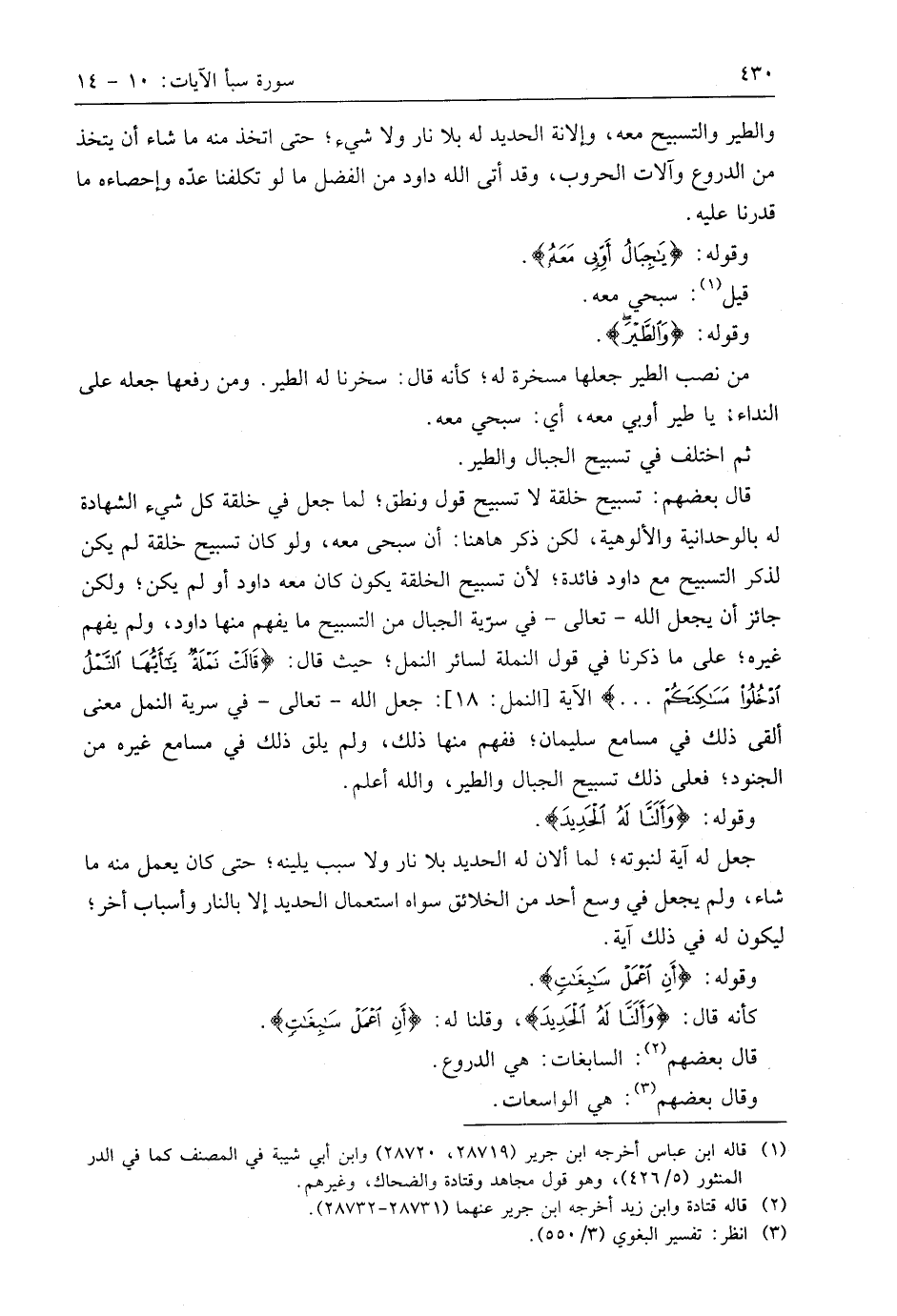 والطير والتسبيح معه، وإلانة الحديد له بلا نار ولا شيء؛ حتى اتخذ منه ما شاء أن يتخذ من الدروع وآلات الحروب، وقد أتى اللَّه داود من الفضل ما لو تكلفنا عدَّه وإحصاءه ما قدرنا عليه.