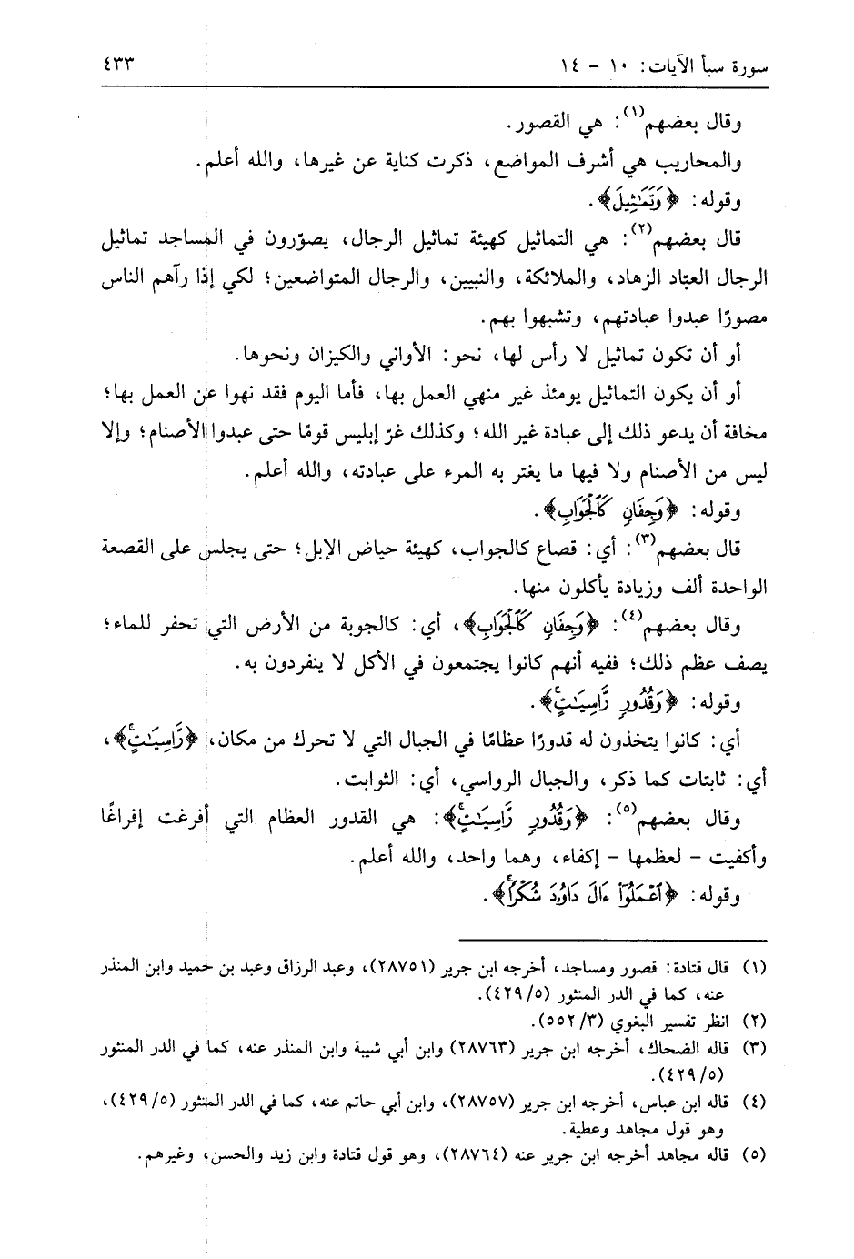 وقَالَ بَعْضُهُمْ: (وَقُدُورٍ رَاسِيَاتٍ): هي القدور العظام التي أفرغت إفراغا وأكفيت - لعظمها - إكفاء، وهما واحد، واللَّه أعلم.