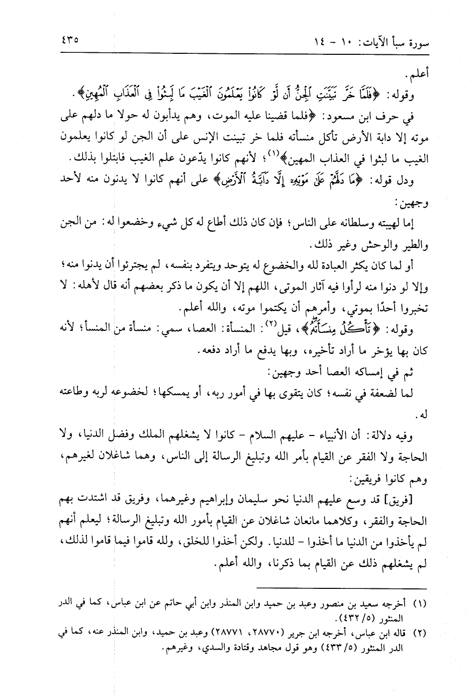 في حرف ابن مسعود: (فلما قضينا عليه الموت، وهم يدأبون له حولا ما دلهم على موته إلا دابة الأرض تأكل منسأته فلما خر تبينت الإنس على أن الجن لو كانوا يعلمون الغيب ما لبثوا في العذاب المهين)؛ لأنهم كانوا يذعون علم الغيب فابتلوا بذلك.