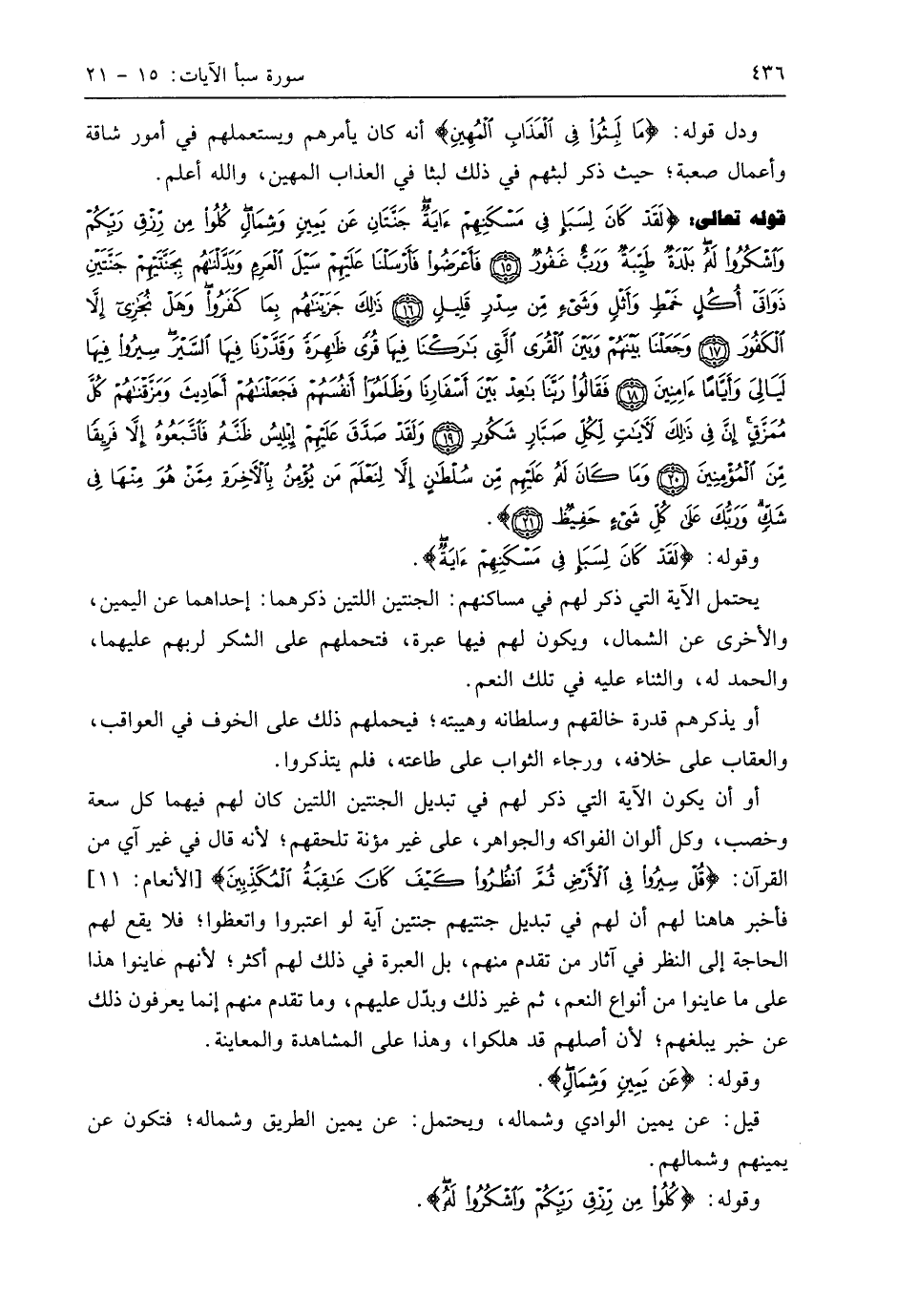 قوله تعالى: (لَقَدْ كَانَ لِسَبَإٍ فِي مَسْكَنِهِمْ آيَةٌ جَنَّتَانِ عَنْ يَمِينٍ وَشِمَالٍ كُلُوا مِنْ رِزْقِ رَبِّكُمْ وَاشْكُرُوا لَهُ بَلْدَةٌ طَيِّبَةٌ وَرَبٌّ غَفُورٌ (15) فَأَعْرَضُوا فَأَرْسَلْنَا عَلَيْهِمْ سَيْلَ الْعَرِمِ وَبَدَّلْنَاهُمْ بِجَنَّتَيْهِمْ جَنَّتَيْنِ ذَوَاتَيْ أُكُلٍ خَمْطٍ وَأَثْلٍ وَشَيْءٍ مِنْ سِدْرٍ قَلِيلٍ (16) ذَلِكَ جَزَيْنَاهُمْ بِمَا كَفَرُوا وَهَلْ نُجَازِي إِلَّا الْكَفُورَ (17) وَجَعَلْنَا بَيْنَهُمْ وَبَيْنَ الْقُرَى الَّتِي بَارَكْنَا فِيهَا قُرًى ظَاهِرَةً وَقَدَّرْنَا فِيهَا السَّيْرَ سِيرُوا فِيهَا لَيَالِيَ وَأَيَّامًا آمِنِينَ (18) فَقَالُوا رَبَّنَا بَاعِدْ بَيْنَ أَسْفَارِنَا وَظَلَمُوا أَنْفُسَهُمْ فَجَعَلْنَاهُمْ أَحَادِيثَ وَمَزَّقْنَاهُمْ كُلَّ مُمَزَّقٍ إِنَّ فِي ذَلِكَ لَآيَاتٍ لِكُلِّ صَبَّارٍ شَكُورٍ (19) وَلَقَدْ صَدَّقَ عَلَيْهِمْ إِبْلِيسُ ظَنَّهُ فَاتَّبَعُوهُ إِلَّا فَرِيقًا مِنَ الْمُؤْمِنِينَ (20) وَمَا كَانَ لَهُ عَلَيْهِمْ مِنْ سُلْطَانٍ إِلَّا لِنَعْلَمَ مَنْ يُؤْمِنُ بِالْآخِرَةِ مِمَّنْ هُوَ مِنْهَا فِي شَكٍّ وَرَبُّكَ عَلَى كُلِّ شَيْءٍ حَفِيظٌ (21)