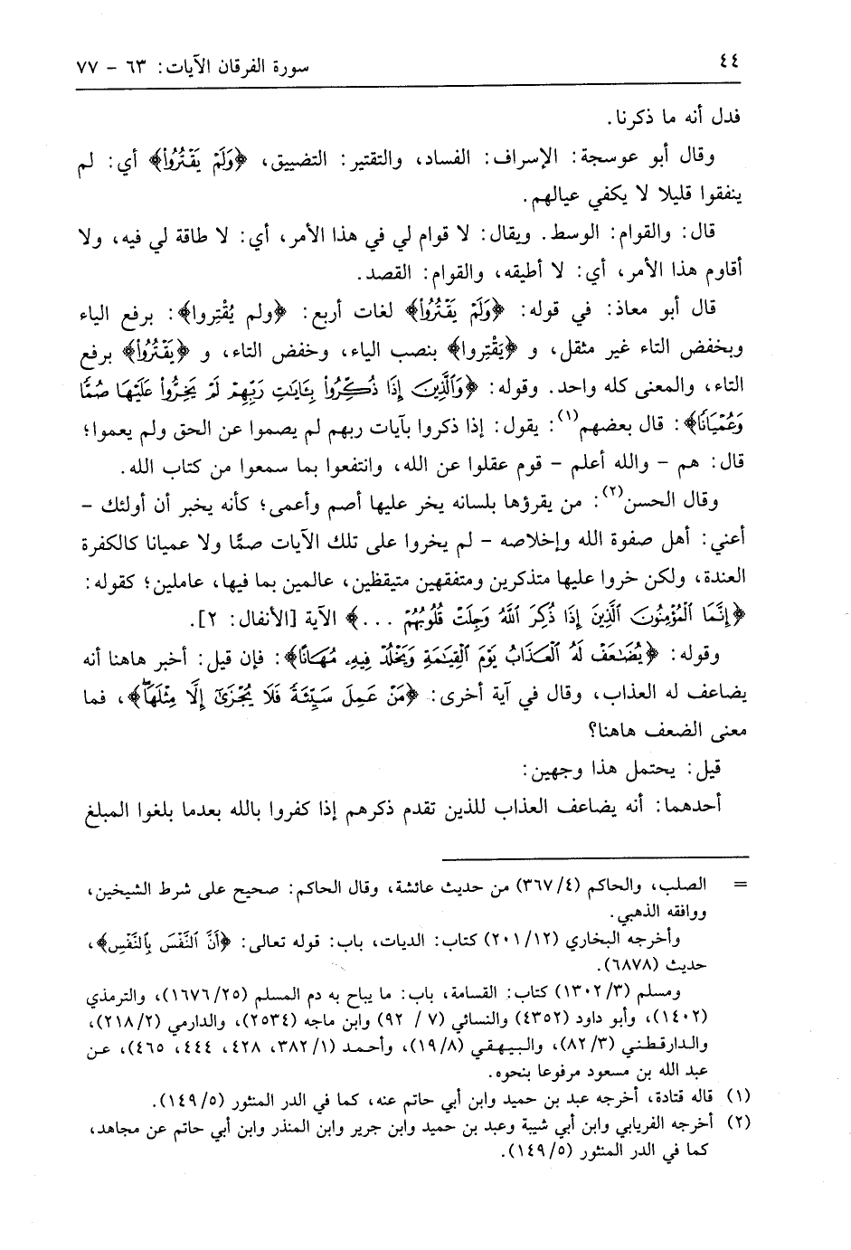 قال أبو معاذ: في قوله: (وَلَمْ يَقْتُرُوا) لغات أربع: (ولم يُقْتِروا): برفع الياء وبخفض التاء غير مثقل، و (يَقْتِروا) بنصب الياء، وخفض التاء، و (يَقْتُرُوا) برفع التاء، والمعنى كله واحد. وقوله: (وَالَّذِينَ إِذَا ذُكِّرُوا بِآيَاتِ رَبِّهِمْ لَمْ يَخِرُّوا عَلَيْهَا صُمًّا وَعُمْيَانًا (73) قَالَ بَعْضُهُمْ: يقول: إذا ذكروا بآيات ربهم لم يصموا عن الحق ولم يعموا؛ قال: هم - واللَّه أعلم - قوم عقلوا عن اللَّه، وانتفعوا بما سمعوا من كتاب اللَّه.