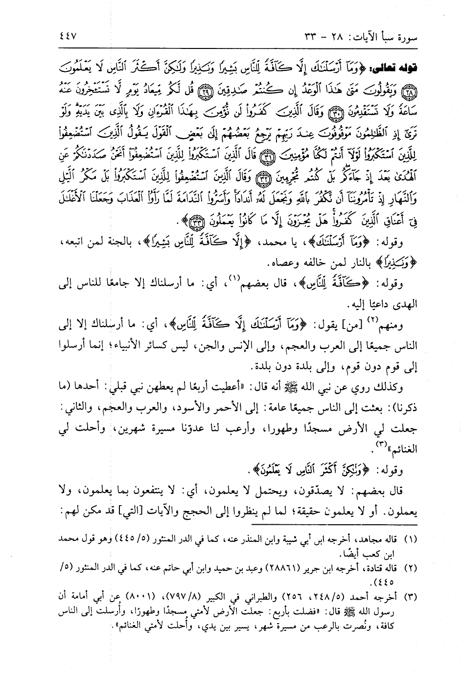 قوله تعالى: (وَمَا أَرْسَلْنَاكَ إِلَّا كَافَّةً لِلنَّاسِ بَشِيرًا وَنَذِيرًا وَلَكِنَّ أَكْثَرَ النَّاسِ لَا يَعْلَمُونَ (28) وَيَقُولُونَ مَتَى هَذَا الْوَعْدُ إِنْ كُنْتُمْ صَادِقِينَ (29) قُلْ لَكُمْ مِيعَادُ يَوْمٍ لَا تَسْتَأْخِرُونَ عَنْهُ سَاعَةً وَلَا تَسْتَقْدِمُونَ (30) وَقَالَ الَّذِينَ كَفَرُوا لَنْ نُؤْمِنَ بِهَذَا الْقُرْآنِ وَلَا بِالَّذِي بَيْنَ يَدَيْهِ وَلَوْ تَرَى إِذِ الظَّالِمُونَ مَوْقُوفُونَ عِنْدَ رَبِّهِمْ يَرْجِعُ بَعْضُهُمْ إِلَى بَعْضٍ الْقَوْلَ يَقُولُ الَّذِينَ اسْتُضْعِفُوا لِلَّذِينَ اسْتَكْبَرُوا لَوْلَا أَنْتُمْ لَكُنَّا مُؤْمِنِينَ (31) قَالَ الَّذِينَ اسْتَكْبَرُوا لِلَّذِينَ اسْتُضْعِفُوا أَنَحْنُ صَدَدْنَاكُمْ عَنِ الْهُدَى بَعْدَ إِذْ جَاءَكُمْ بَلْ كُنْتُمْ مُجْرِمِينَ (32) وَقَالَ الَّذِينَ اسْتُضْعِفُوا لِلَّذِينَ اسْتَكْبَرُوا بَلْ مَكْرُ اللَّيْلِ وَالنَّهَارِ إِذْ تَأْمُرُونَنَا أَنْ نَكْفُرَ بِاللَّهِ وَنَجْعَلَ لَهُ أَنْدَادًا وَأَسَرُّوا النَّدَامَةَ لَمَّا رَأَوُا الْعَذَابَ وَجَعَلْنَا الْأَغْلَالَ فِي أَعْنَاقِ الَّذِينَ كَفَرُوا هَلْ يُجْزَوْنَ إِلَّا مَا كَانُوا يَعْمَلُونَ (33)