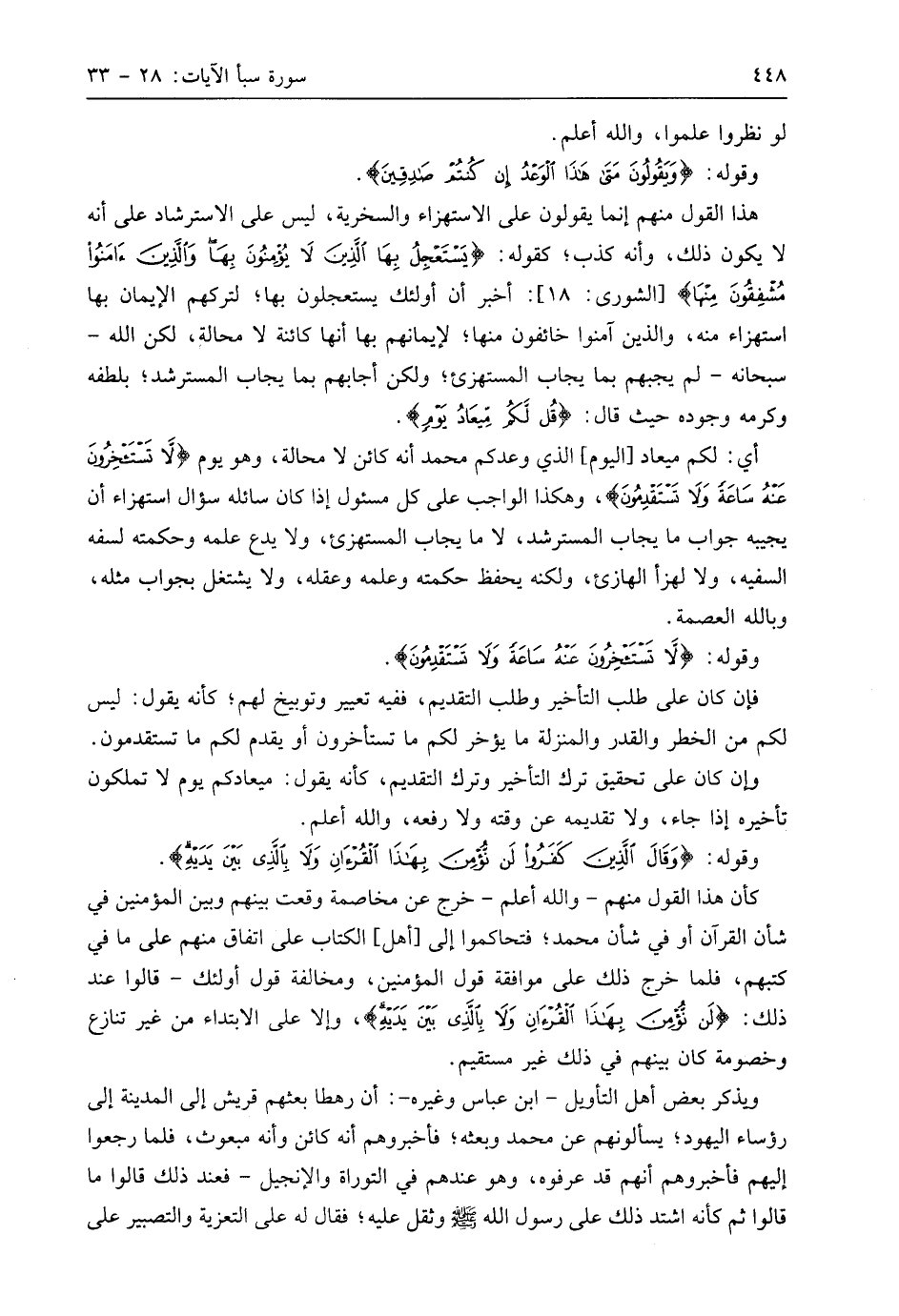 وقوله: (وَقَالَ الَّذِينَ كَفَرُوا لَنْ نُؤْمِنَ بِهَذَا الْقُرْآنِ وَلَا بِالَّذِي بَيْنَ يَدَيْهِ وَلَوْ تَرَى إِذِ الظَّالِمُونَ مَوْقُوفُونَ عِنْدَ رَبِّهِمْ يَرْجِعُ بَعْضُهُمْ إِلَى بَعْضٍ الْقَوْلَ يَقُولُ الَّذِينَ اسْتُضْعِفُوا لِلَّذِينَ اسْتَكْبَرُوا لَوْلَا أَنْتُمْ لَكُنَّا مُؤْمِنِينَ (31) كأن هذا القول منهم - واللَّه أعلم - خرج عن مخاصمة وقعت بينهم وبين المؤمنين في شأن القرآن أو في شأن مُحَمَّد؛ فتحاكموا إلى أهل الكتاب على اتفاق منهم على ما في كتبهم، فلما خرج ذلك على موافقة قول المؤمنين، ومخالفة قول أُولَئِكَ - قالوا عند ذلك: (لَنْ نُؤْمِنَ بِهَذَا الْقُرْآنِ وَلَا بِالَّذِي بَيْنَ يَدَيْهِ)، وإلا على الابتداء من غير تنازع وخصومة كان بينهم في ذلك غير مستقيم.