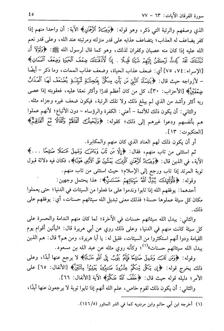 ثم استثنى من تاب منهم، فقال: (إِلَّا مَنْ تَابَ وَآمَنَ وَعَمِلَ عَمَلًا صَالِحًا. . .) الآية، في الذين قال: (وَعِبَادُ الرَّحْمَنِ الَّذِينَ يَمْشُونَ عَلَى الْأَرْضِ هَوْنًا)، فكان فيه دلالة قبول توبة المرتد إذا تاب ورجع إلى الإسلام؛ حيث استثنى من تاب منهم.