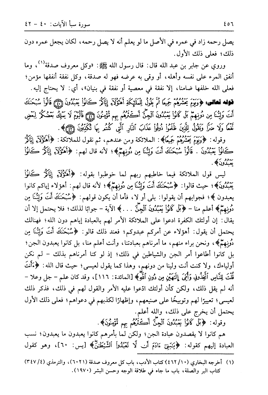 ليس قول الملائكة فيما خاطبهم ربهم لما خوطبوا بقوله: (أَهَؤُلَاءِ إِيَّاكُمْ كَانُوا يَعْبُدُونَ)؛ حيث قالوا: (سُبْحَانَكَ أَنْتَ وَلِيُّنَا مِنْ دُونِهِمْ)؛ لأنه قال لهم: (أَهَؤُلَاءِ إِيَّاكُمْ كَانُوا يَعْبُدُونَ)؛ فجوابهم أن يقولوا: بلى أو لا، فأما أن يكون قولهم: (سُبْحَانَكَ أَنْتَ وَلِيُّنَا مِنْ دُونِهِمْ) أعلم منا - (بَلْ كَانُوا يَعْبُدُونَ. . .) الآية - جوابًا لذلك؛ فلا يحتمل إلا أن يقال: إن أُولَئِكَ الكفرة ادعوا على الملائكة الأمر لهم بالعبادة إياهم دون اللَّه؛ فهنالك يحتمل أن يقول: أهَؤُلَاءِ عن أمركم عبدوكم؛ فعند ذلك قالو: (سُبْحَانَكَ أَنْتَ وَلِيُّنَا مِنْ دُونِهِمْ)، ونحن براء منهم، ما أمرناهم بعبادتنا، وأنت أعلم منا، بل كانوا يعبدون الجن؛ بل كانوا أطاعوا أمر الجن والشياطين في ذلك؛ إذ لو كنا أمرناهم بذلك - لم نكن أولياءك، ولا كنت أنت ولينا من دونه، وهذا كما يقول لعيسى؛ حيث قال اللَّه: (أَأَنْتَ قُلْتَ لِلنَّاسِ اتَّخِذُونِي وَأُمِّيَ إِلَهَيْنِ مِنْ دُونِ اللَّهِ)، وقد كان علم - جل وعلا - أنه لم يقل ذلك، ولكن كأن أُولَئِكَ ادعوا عليه الأمر والقول لهم في ذلك، فذكر ذلك لعيسى؛ تعييرًا لهم وتوبيخا على صنيعهم، وإظهارًا لكذبهم في دعواهم؛ فعلى ذلك الأول يحتمل أن يخرج على ذلك، واللَّه أعلم.