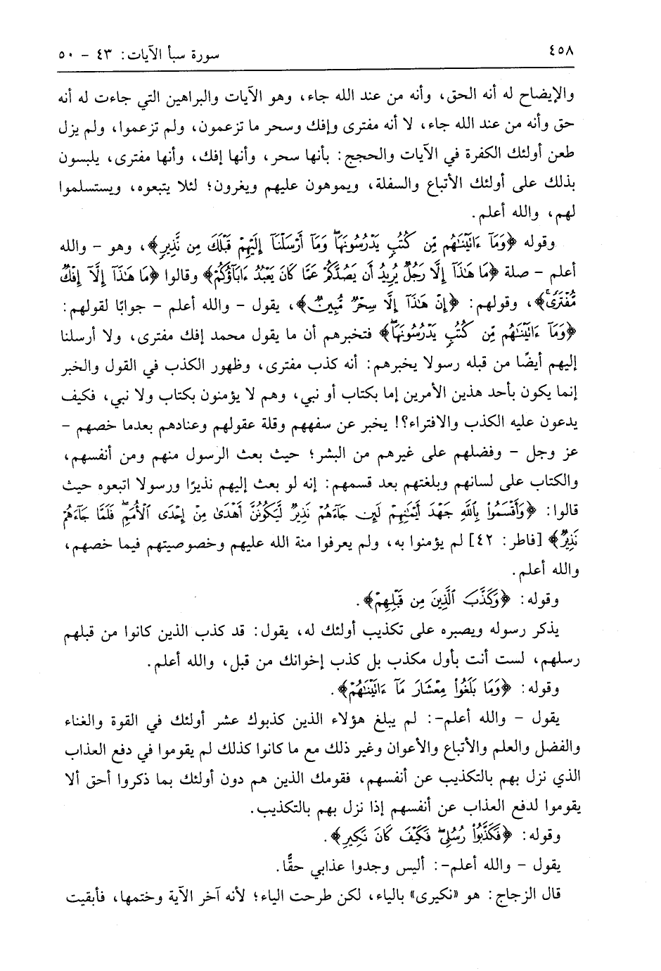 وقوله (وَمَا آتَيْنَاهُمْ مِنْ كُتُبٍ يَدْرُسُونَهَا وَمَا أَرْسَلْنَا إِلَيْهِمْ قَبْلَكَ مِنْ نَذِيرٍ (44) وهو - واللَّه أعلم - صلة (مَا هَذَا إِلَّا رَجُلٌ يُرِيدُ أَنْ يَصُدَّكُمْ عَمَّا كَانَ يَعْبُدُ آبَاؤُكُمْ) وقالوا (مَا هَذَا إِلَّا إِفْكٌ مُفْتَرًى)، وقولهم: (إِنْ هَذَا إِلَّا سِحْرٌ مُبِينٌ)، يقول - واللَّه أعلم - جوابًا لقولهم: (وَمَا آتَيْنَاهُمْ مِنْ كُتُبٍ يَدْرُسُونَهَا) فتخبرهم أن ما يقول مُحَمَّد إفك مفترى، ولا أرسلنا إليهم أيضًا من قبله رسولا يخبرهم: أنه كذب مفترى، وظهور الكذب في القول والخبر إنما يكون بأحد هذين الأمرين إما بكتاب أو نبي، وهم لا يؤمنون بكتاب ولا نبي، فكيف يدعون عليه الكذب والافتراء؟! يخبر عن سفههم وقلة عقولهم وعنادهم بعدما خصهم - عَزَّ وَجَلَّ - وفضلهم على غيرهم من البشر؛ حيث بعث الرسول منهم ومن أنفسهم، والكتاب على لسانهم وبلغتهم بعد قسمهم: إنه لو بعث إليهم نذيرًا ورسولا اتبعوه حيث قالوا: (وَأَقْسَمُوا بِاللَّهِ جَهْدَ أَيْمَانِهِمْ لَئِنْ جَاءَهُمْ نَذِيرٌ لَيَكُونُنَّ أَهْدَى مِنْ إِحْدَى الْأُمَمِ فَلَمَّا جَاءَهُمْ نَذِيرٌ)، لم يؤمنوا به، ولم يعرفوا منة اللَّه عليهم وخصوصيتهم فيما خصهم، واللَّه أعلم.