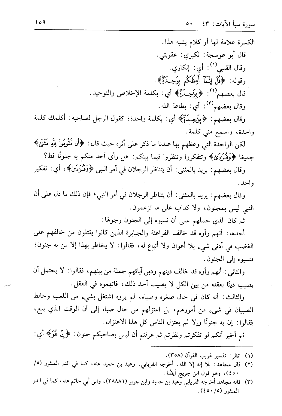 وقَالَ بَعْضُهُمْ: يريد بالمثنى: أن يتناظر الرجلان في أمر النبي؛ فإن ذلك ما دل على أن النبي ليس بمجنون، ولا كذاب على ما تزعمون.