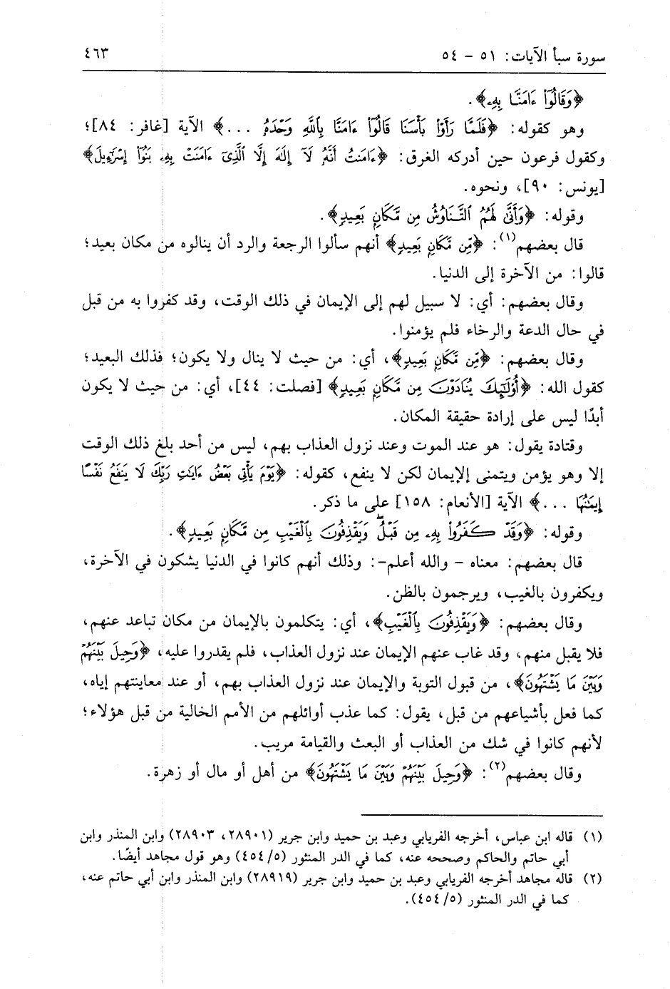 وقَالَ بَعْضُهُمْ: (وَيَقْذِفُونَ بِالْغَيْبِ)، أي: يتكلمون بالإيمان من مكان تباعد عنهم، فلا يقبل منهم: وقد غاب عنهم الإيمان عند نزول العذاب، فلم يقدروا عليه، (وَحِيلَ بَيْنَهُمْ وَبَيْنَ مَا يَشْتَهُونَ ... (54) من قبول التوبة والإيمان عند نزول العذاب بهم، أو عند معاينتهم إياه، كما فعل بأشياعهم من قبل، يقول: كما عذب أوائلهم من الأمم الخالية من قبل هَؤُلَاءِ؛ لأنهم كانوا في شك من العذاب أو البعث والقيامة مريب.