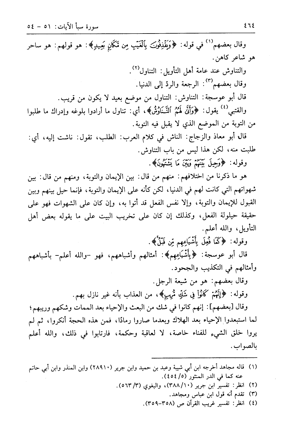 والْقُتَبِيّ يقول: (وَأَنَّى لَهُمُ التَّنَاوُشُ)، أي: تناول ما أرادوا بلوغه وإدراك ما طلبوا من التوبة من الموضع الذي لا يقبل فيه التوبة.